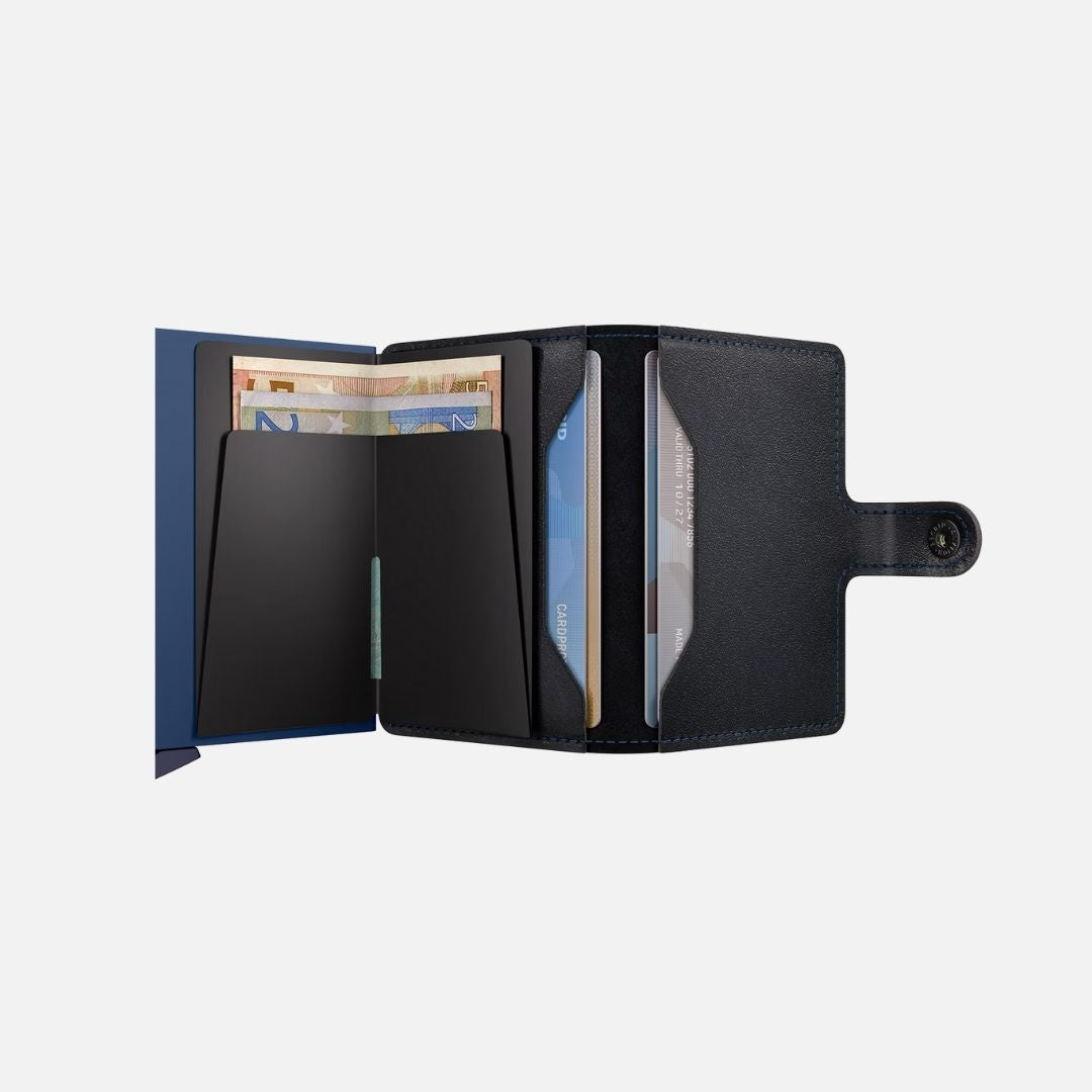 De tamaño pequeño pero con una capacidad sorprendentemente grande: la Miniwallet satisface todas las necesidades. La cubierta exterior puede contener billetes, tickets y tarjetas, mientras que el Cardprotector de aluminio permite extraer las tarjetas con un simple movimiento, evitando que se doblen, rompan o lean sin que nos demos cuenta.