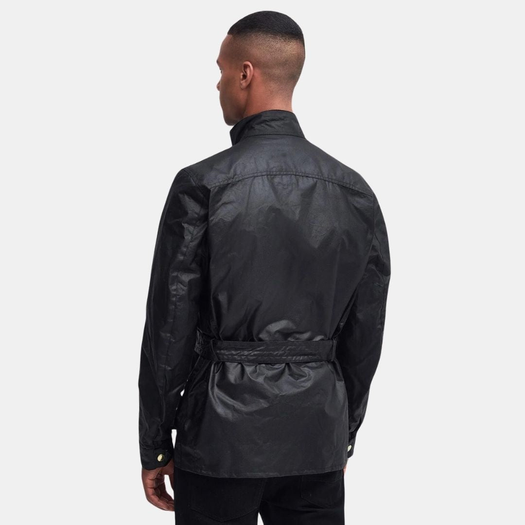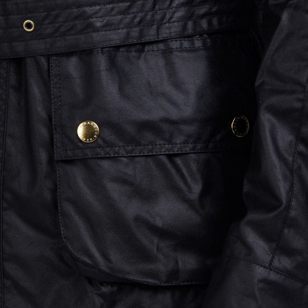 Los detalles distintivos de la chaqueta de motociclista incluyen puños ajustables con tachuelas, una correa de cuello y cinturón con cierre de hebilla y los cuatro bolsillos con tachuelas característicos, uno de los cuales es el auténtico bolsillo inclinado para mapas, diseñado para brindar un fácil acceso mientras conduces. Una insignia de Union Jack agrega un toque patriótico adicional al pecho, acompañada por la inimitable marca Barbour International.