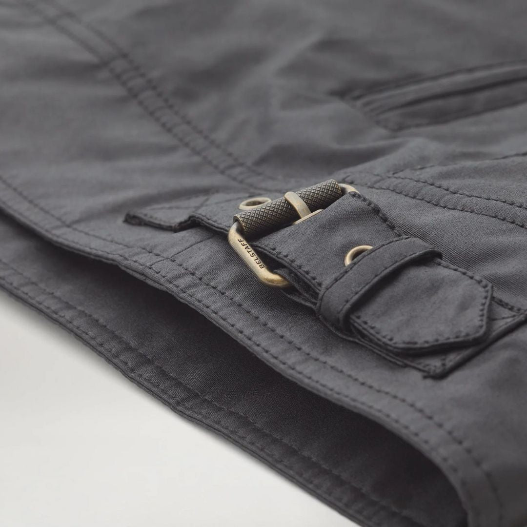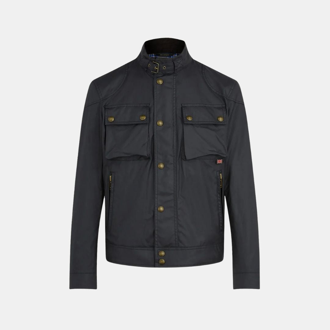 - Piezas metálicas emblemáticas de latón antiguo, con «Belstaff England» grabado en la parte redonda y el emblemático parche tejido del ave fénix en la manga izquierda