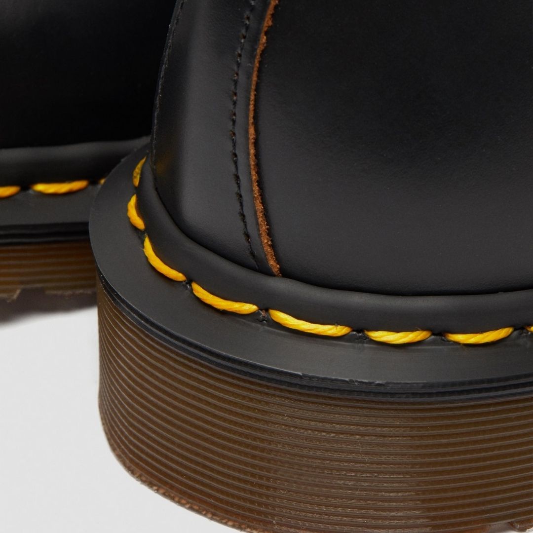 La colección Dr. Martens Made in England Vintage sigue elaborándose en la fábrica original de Wellingborough. Los zapateros siguen las técnicas originales de construcción para crear este zapato 1461 de 3 ojalillos confeccionado en cuero Quilon, una reedición del cuero clásico original de Dr. Martens. El cuero es resistente, tiene un acabado liso y se ha creado utilizando nuestra horma «59» Last, con el corte más característico. Es un producto con vira Goodyear: la pala y la suela van cosidas y no simplemente encoladas, como sucede con muchos modelos de calzado. La suela con cámara de aire Dr. Martens tiene una buena resistencia contra la abrasión, los resbalones, el aceite y la grasa. Las pequeñas hendiduras visibles en la vira, realizadas por la máquina de coser original, hacen que estos zapatos sean únicos de Dr. Martens.