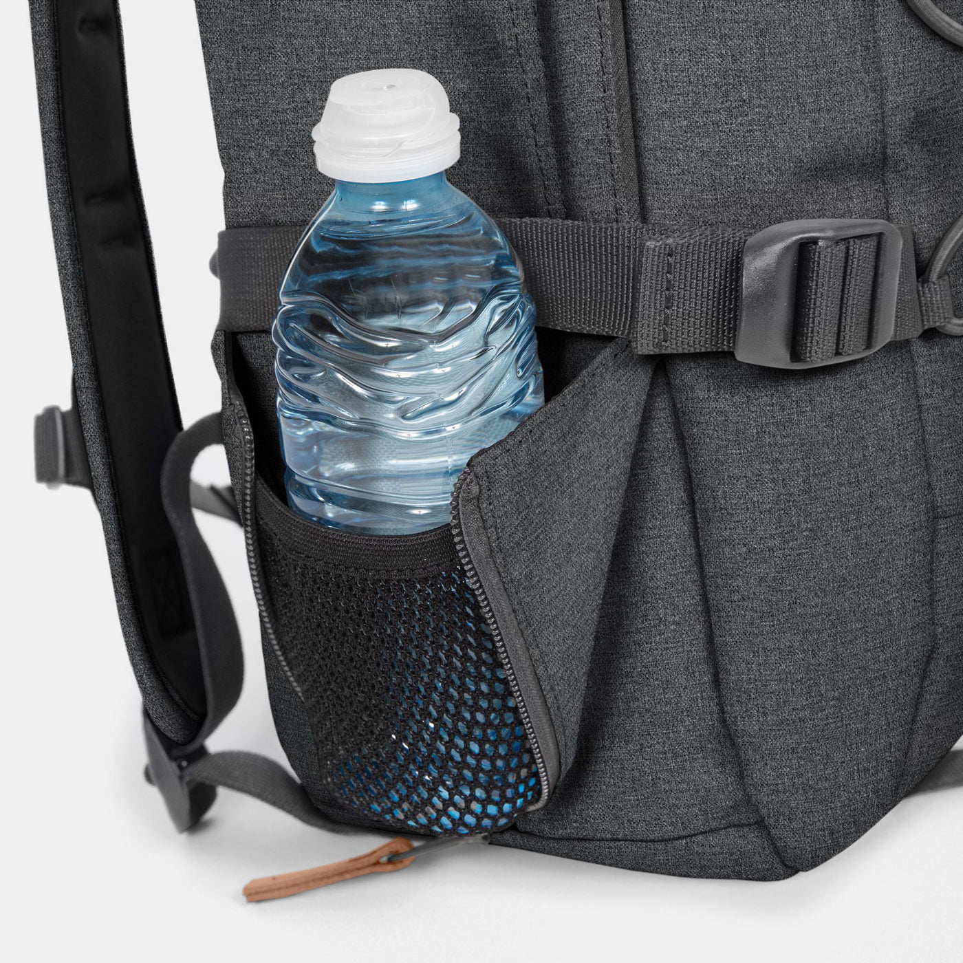 Una ochila amplia con un gran compartimento principal, una funda para el portátil y un portabotellas. Está diseñada para aventuras al aire libre y tiene correas de compresión y una cuerda elástica externa para sujetar accesorios adicionales sobre la marcha.