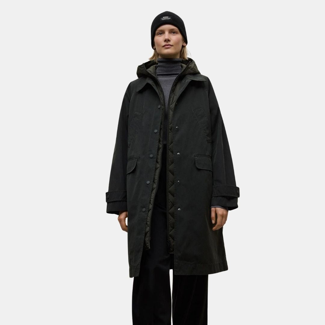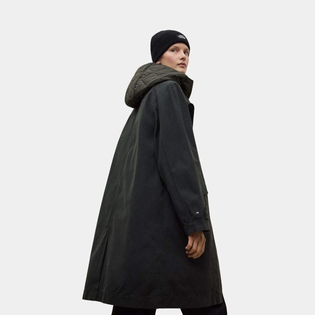 El abrigo Hyden está confeccionado con 54% Poliéster reciclado y 46% Algodón orgánico, con relleno de 100% Poliéster reciclado. El poliéster reciclado reduce el uso de recursos fósiles, emisiones de CO2 y consumo de agua y energía, al reutilizar residuos plásticos como botellas PET, manteniendo las propiedades del poliéster virgen. Prenda exterior: