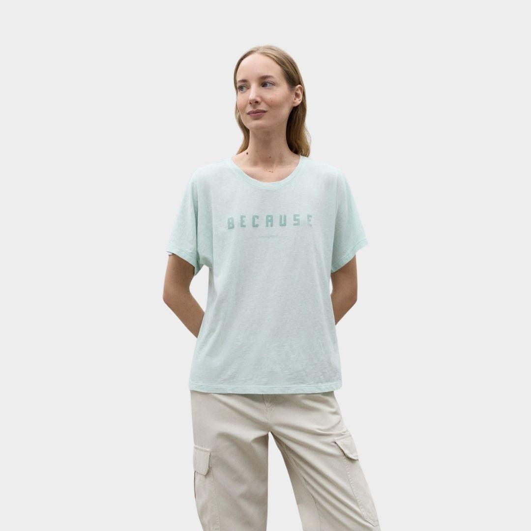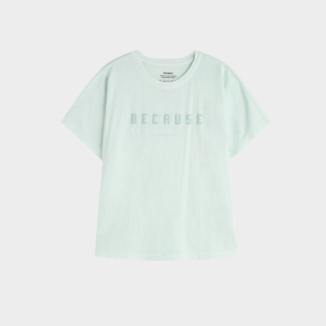 La camiseta Kemi está hecha con 80% Algodón orgánico cultivado de manera natural que nos permite reducir el uso de agua empleada en el proceso de producción. Además lleva impreso "Because", que hace referencia al claim "Because There Is No Planet B®.