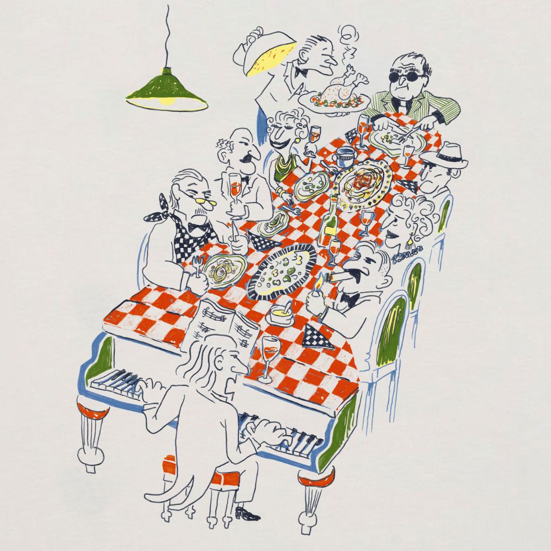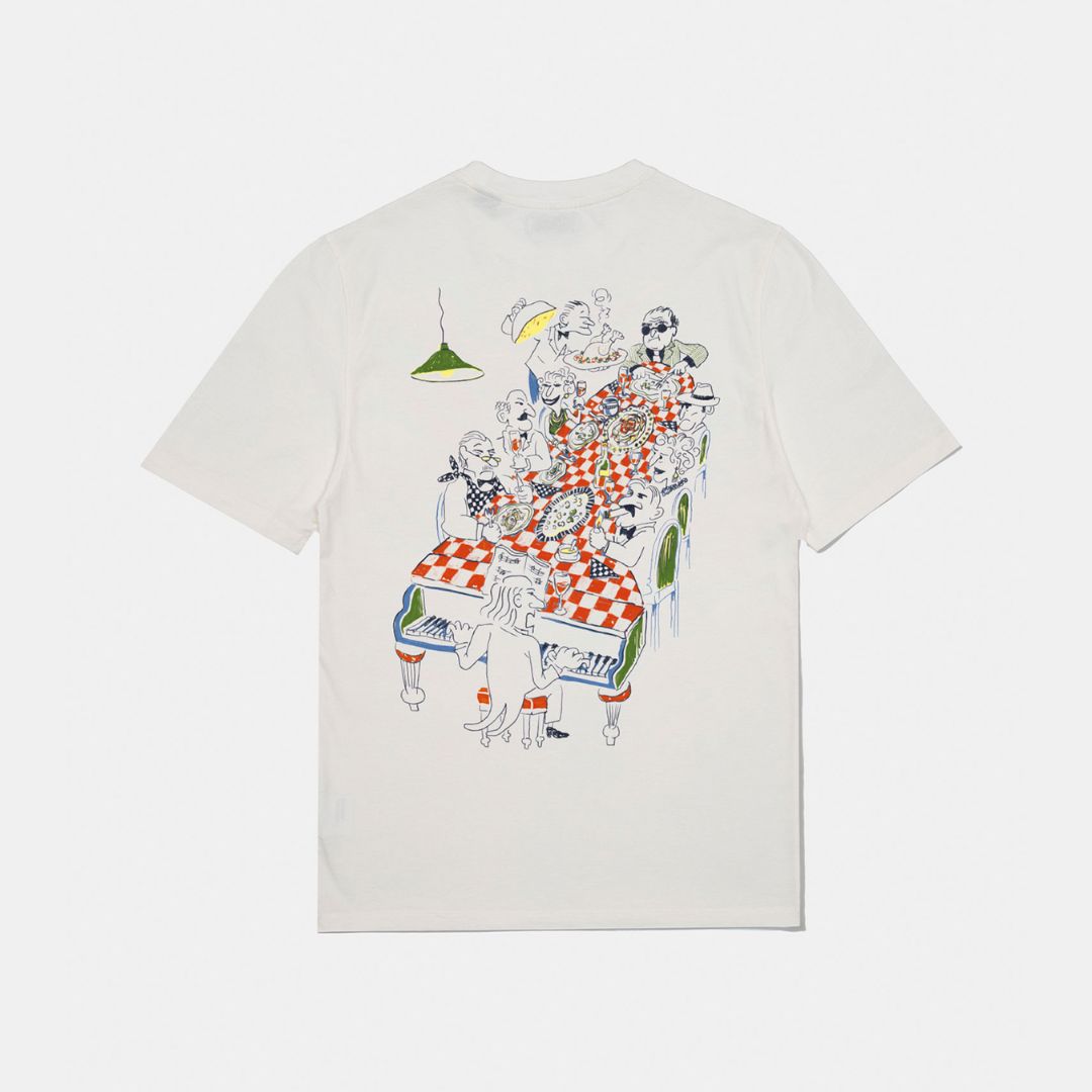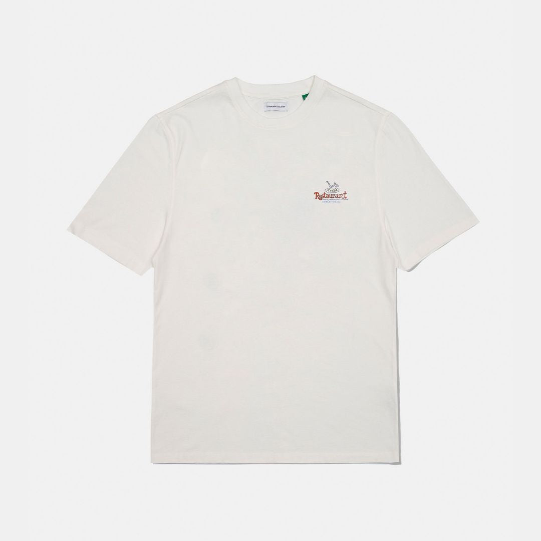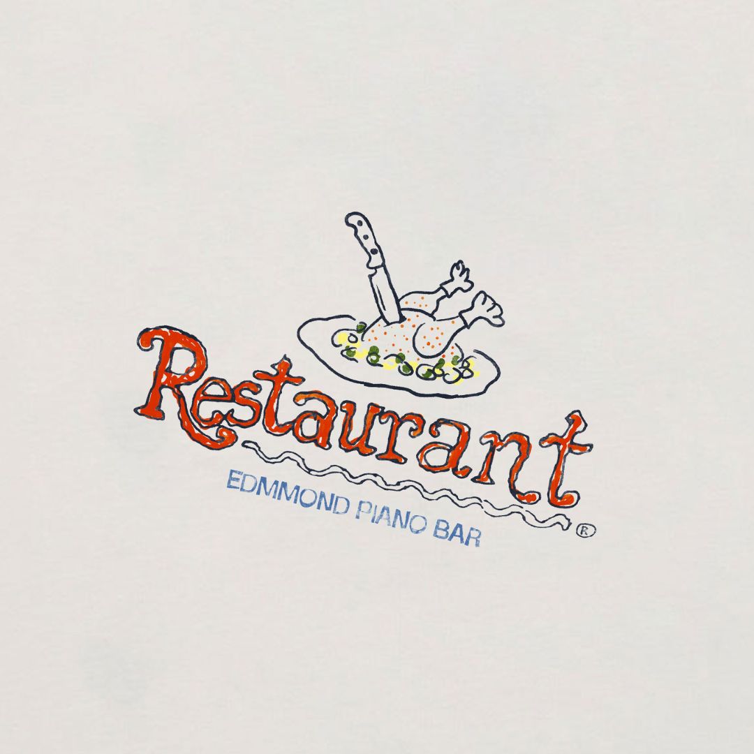 Camiseta blanca de manga corta, fabricada con algodón 100% orgánico. Diseñada con un corte relajado y una longitud perfecta. Con un diseño especial en tonos verdes y rojos "Piano Bar" en la parte trasera y el logotipo "Restaurant Edmmond Studios" en la parte frontal izquierda.