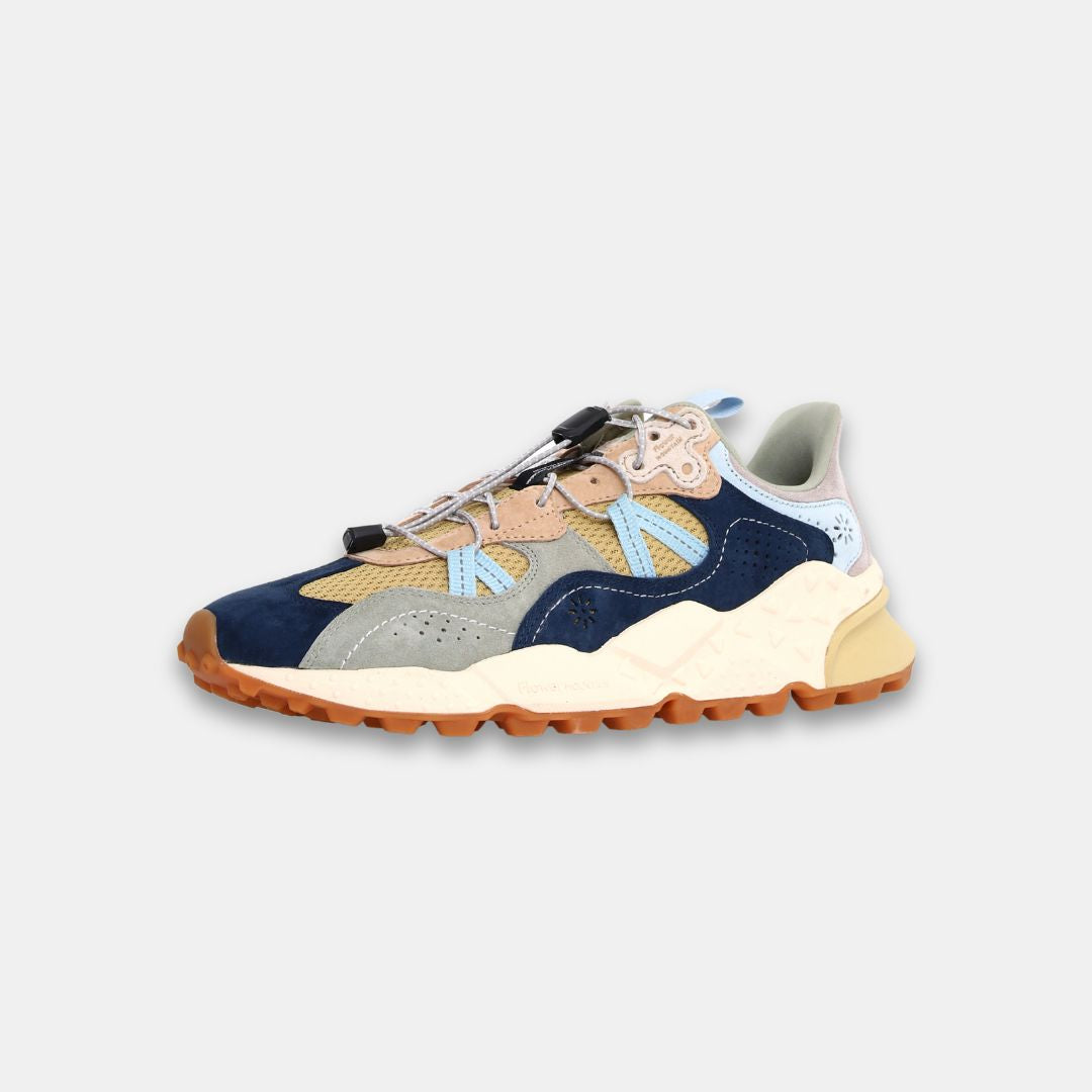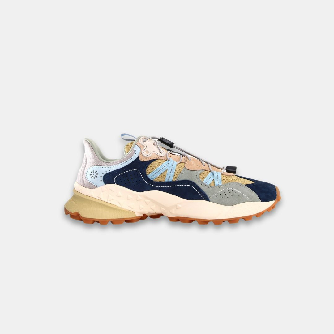 Zapatilla en tejido técnico ripstop y ante. Detalles de perforaciones, ojales reforzados y cierre de seguridad. Plantilla extraíble de corcho natural, suela de goma con dibujo dentado.