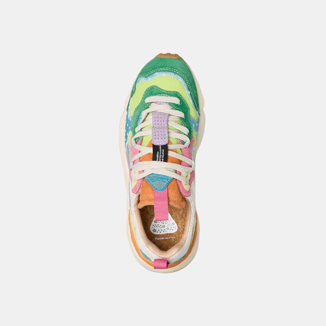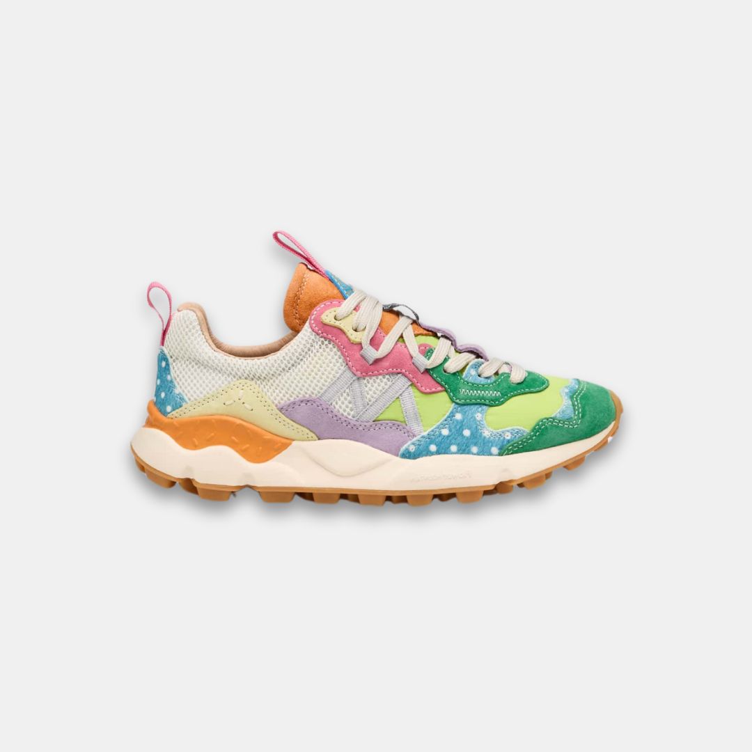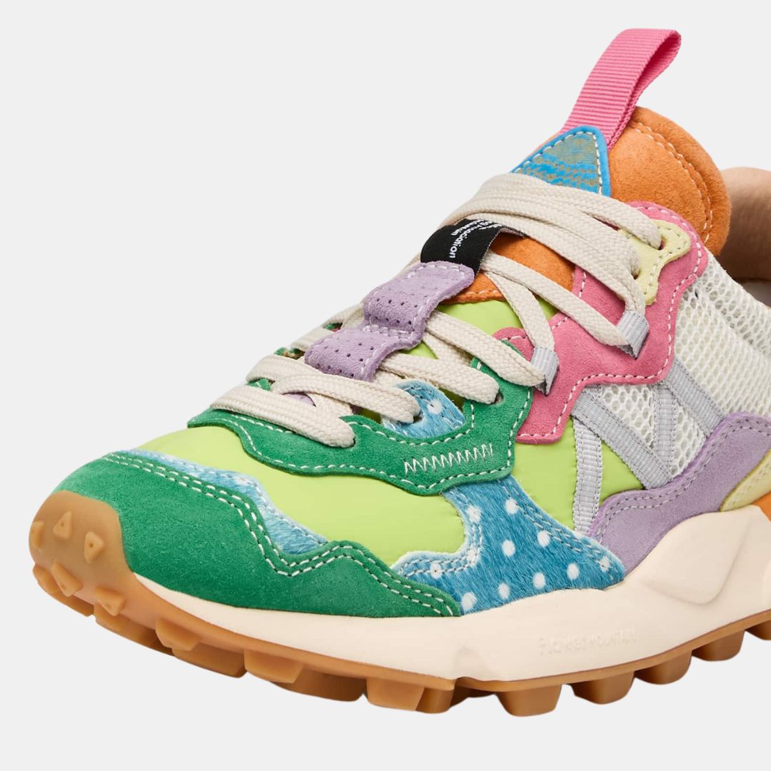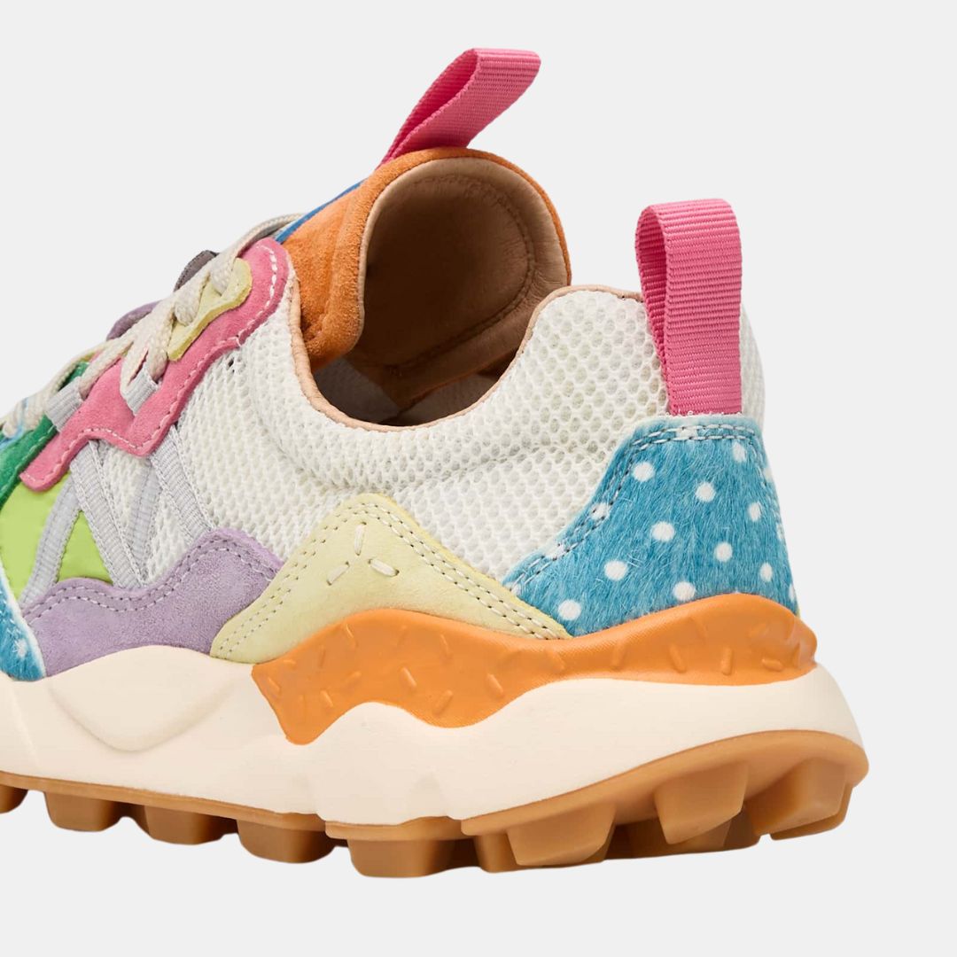 Zapatilla con construcción outdoor, con parte superior en tejido técnico. Las inserciones de ante multicolor se complementan con detalles de piel de poni de colores con estampado de lunares. Forro de piel y plantilla de corcho natural antibacteriano. Suela de goma con dibujo dentado.