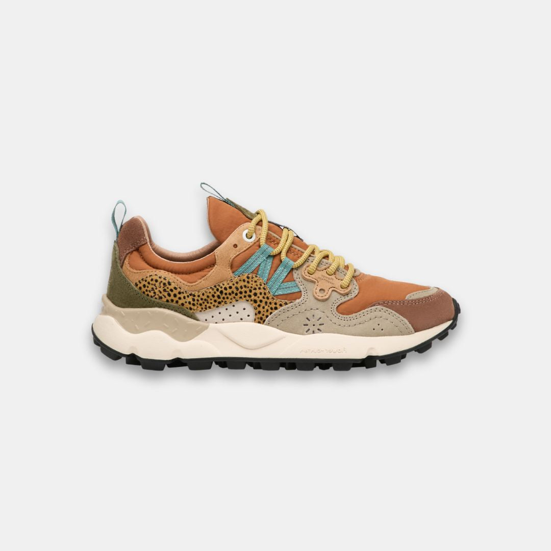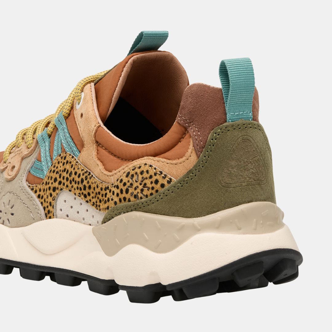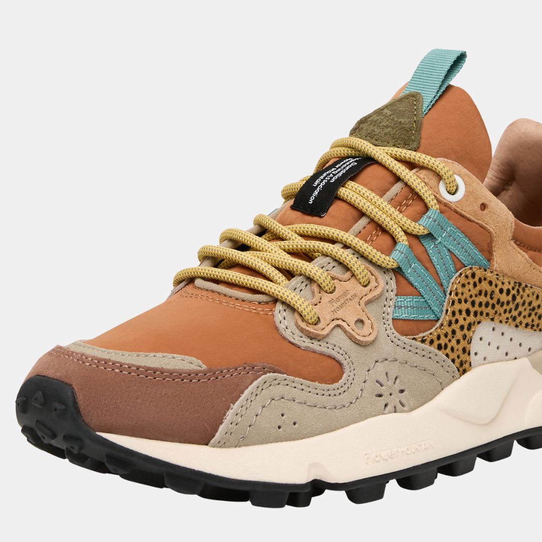 Zapatillas deportivas de tejido técnico y ante, con puntera de poni con estampado animalier. Cierre con cordones de trekking y ojales personalizados. Forro de tejido y piel, con plantilla de corcho natural antibacteriano. Suela de goma ultraligera con compuesto bicolor y dibujo dentado.