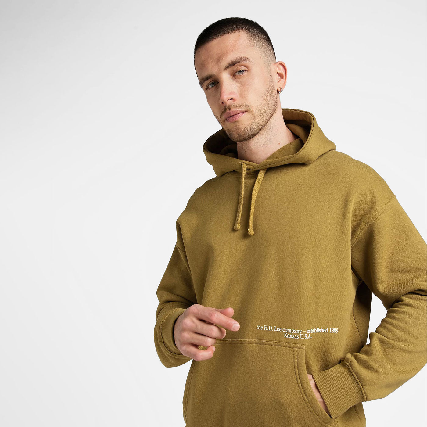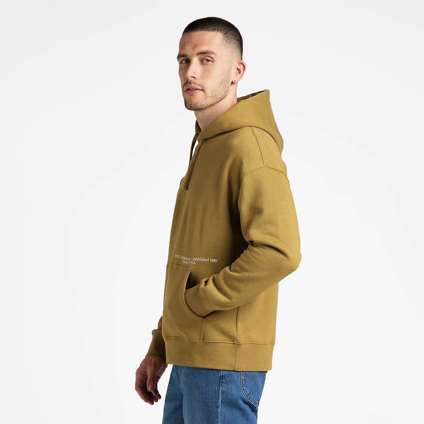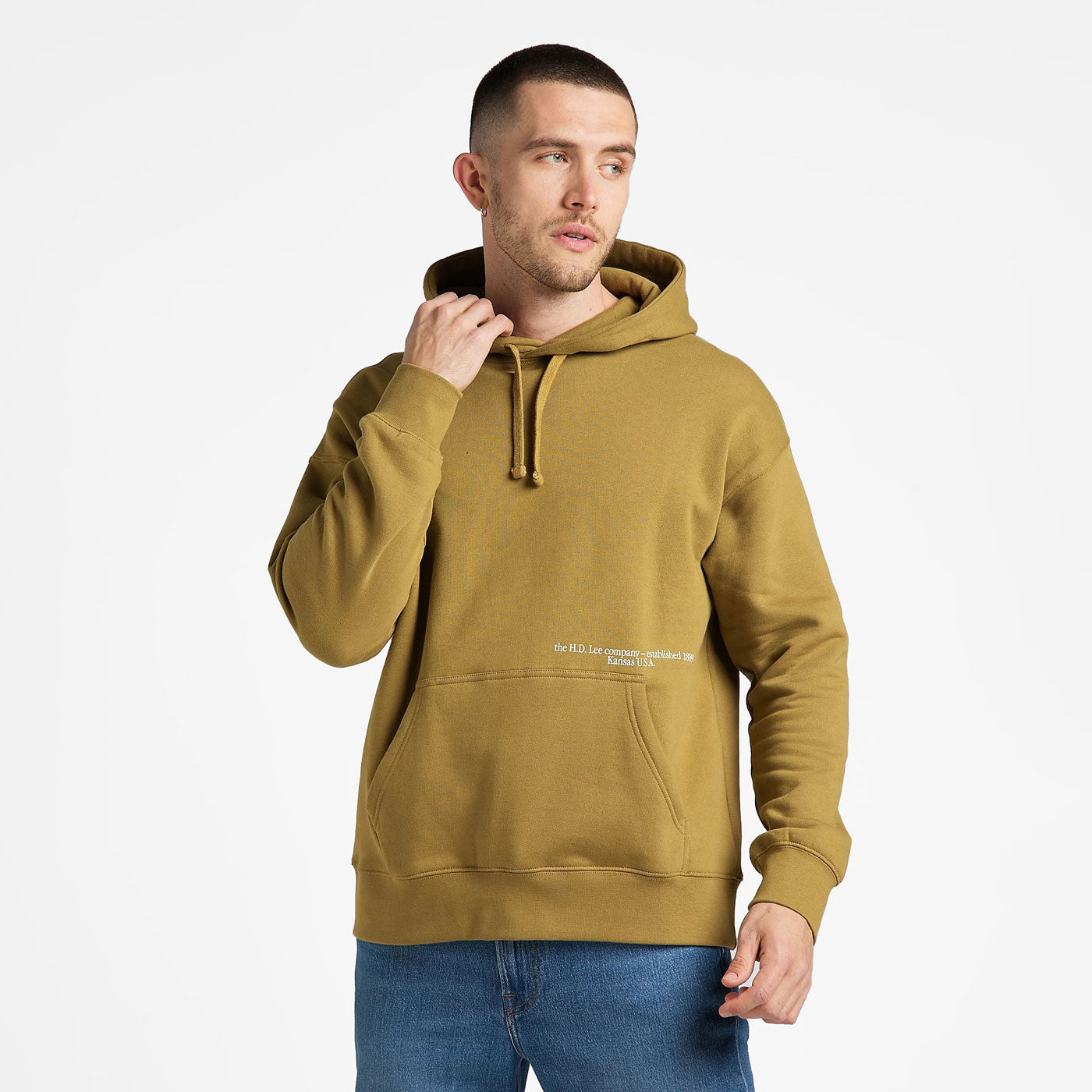 Incluye estampados colocados en una posición inusual en el pecho, cerca del bolsillo canguro, así como un gran logotipo Wobbly Lee en la espalda.