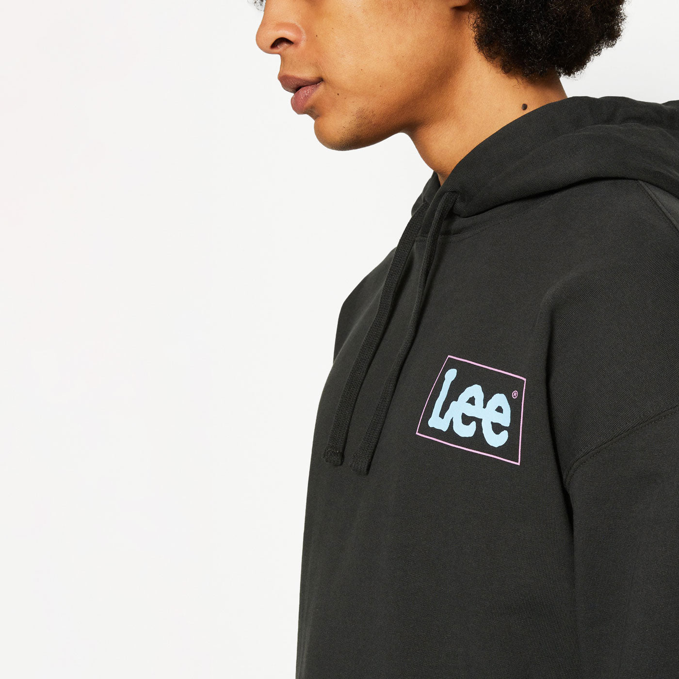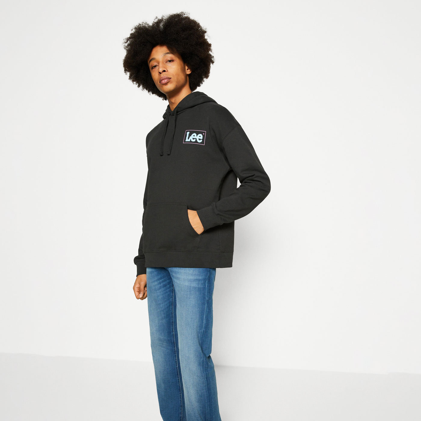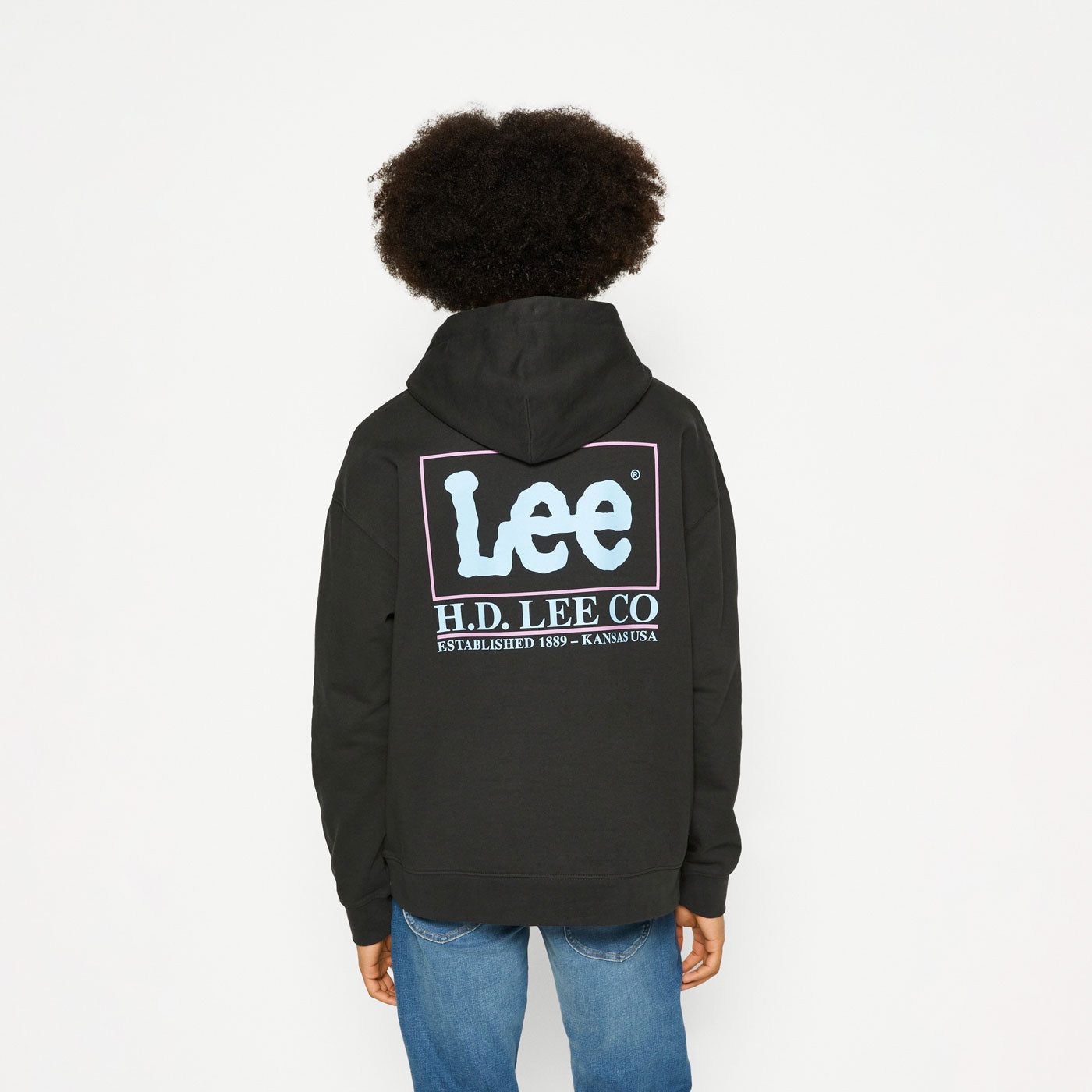 Incluye el logotipo de Lee en la parte delantera y grandes estampados en la espalda, además del bolsillo canguro y los cordones ajustables.