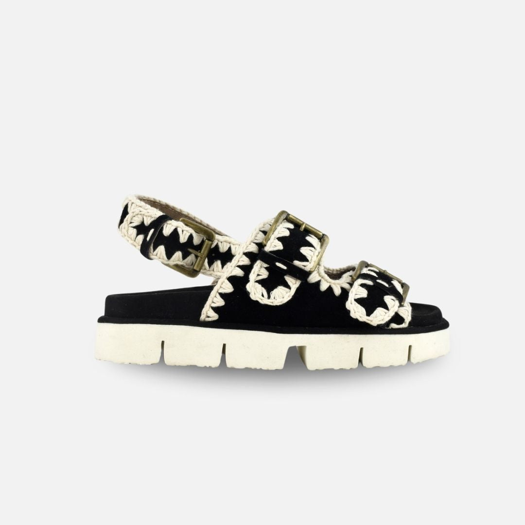 Las nuevas sandalias bio con hebilla ofrecen el look perfecto para un verano relajado y elegante. Completa con dos correas delanteras, una trasera, la característica costura de ganchillo de Mou, una ligera suela exterior de EVA y plantilla de ante para mayor comodidad.