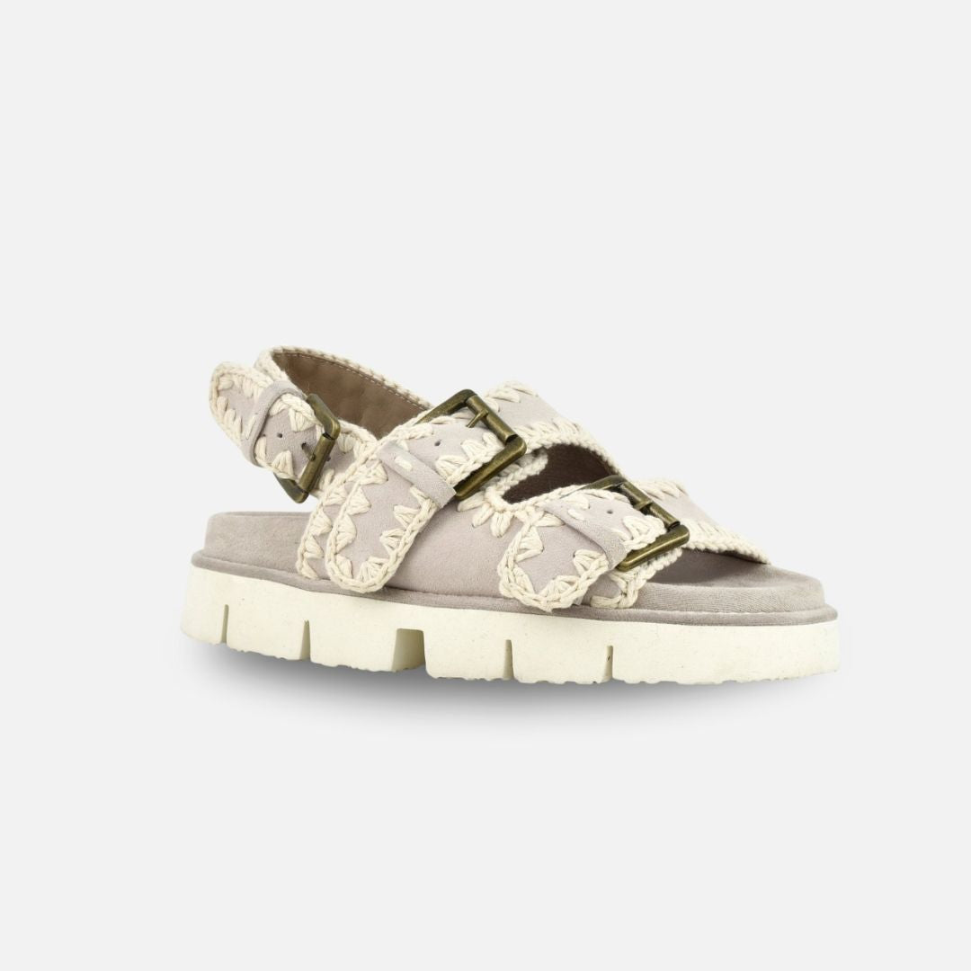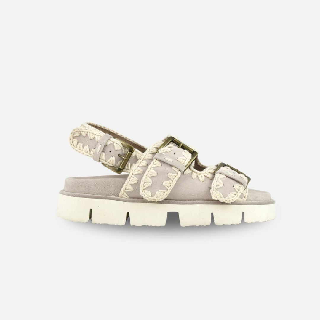 Las nuevas sandalias bio con hebilla ofrecen el look perfecto para un verano relajado y elegante. Completa con dos correas delanteras, una trasera, la característica costura de ganchillo de Mou, una ligera suela exterior de EVA y plantilla de ante para mayor comodidad.