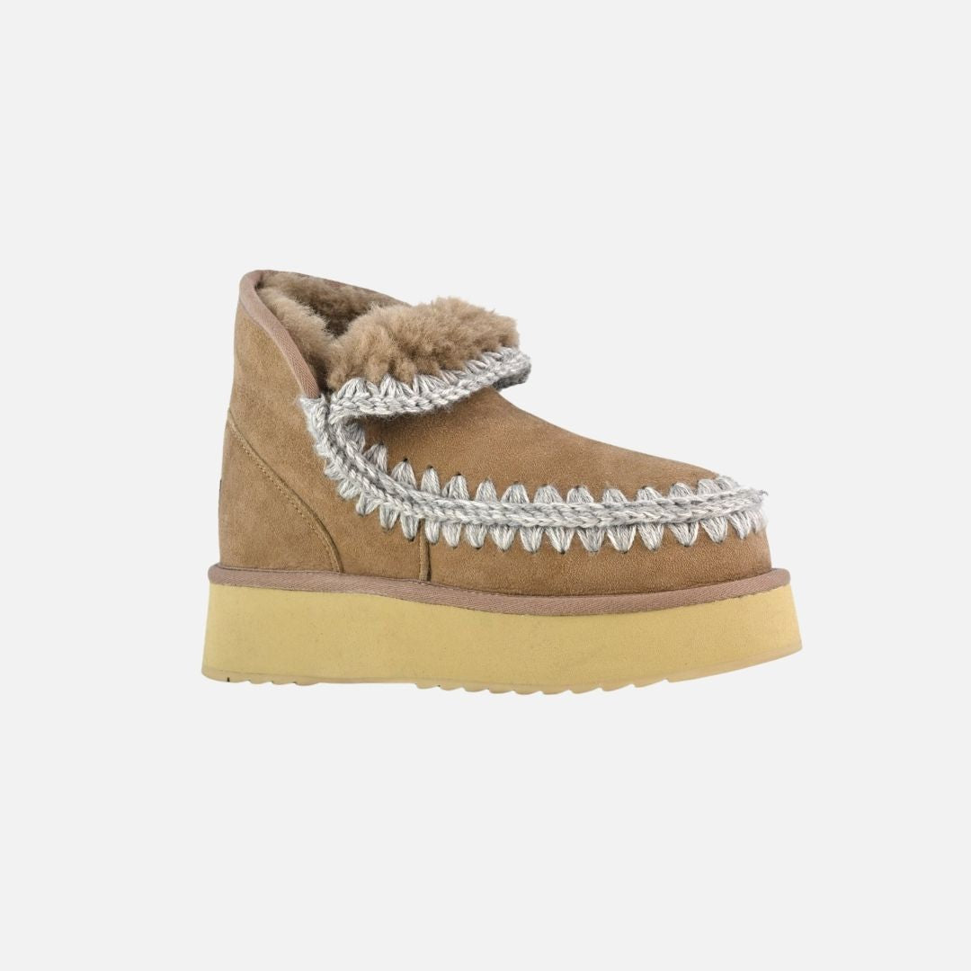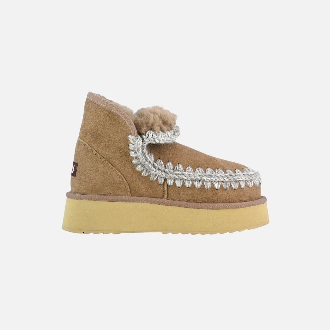 Novedad para la temporada Otoño-Invierno 24, las botas de plataforma mini eskimo están realizadas a mano por artesanos expertos en lujoso ante con las características costuras de lana de la marca. Increíblemente cómodas y resistentes con suela de EVA. Altura 18 cm.
