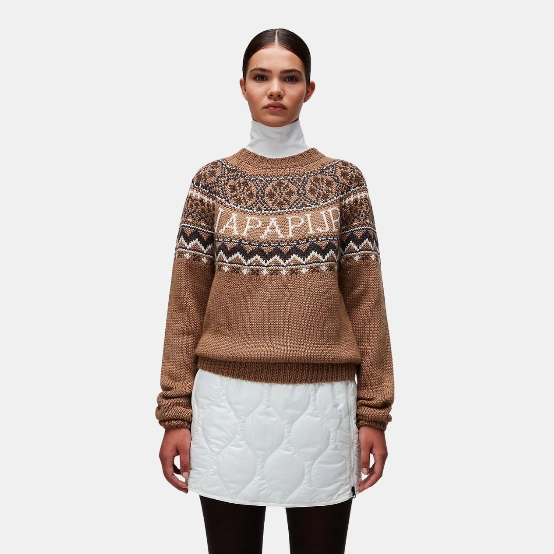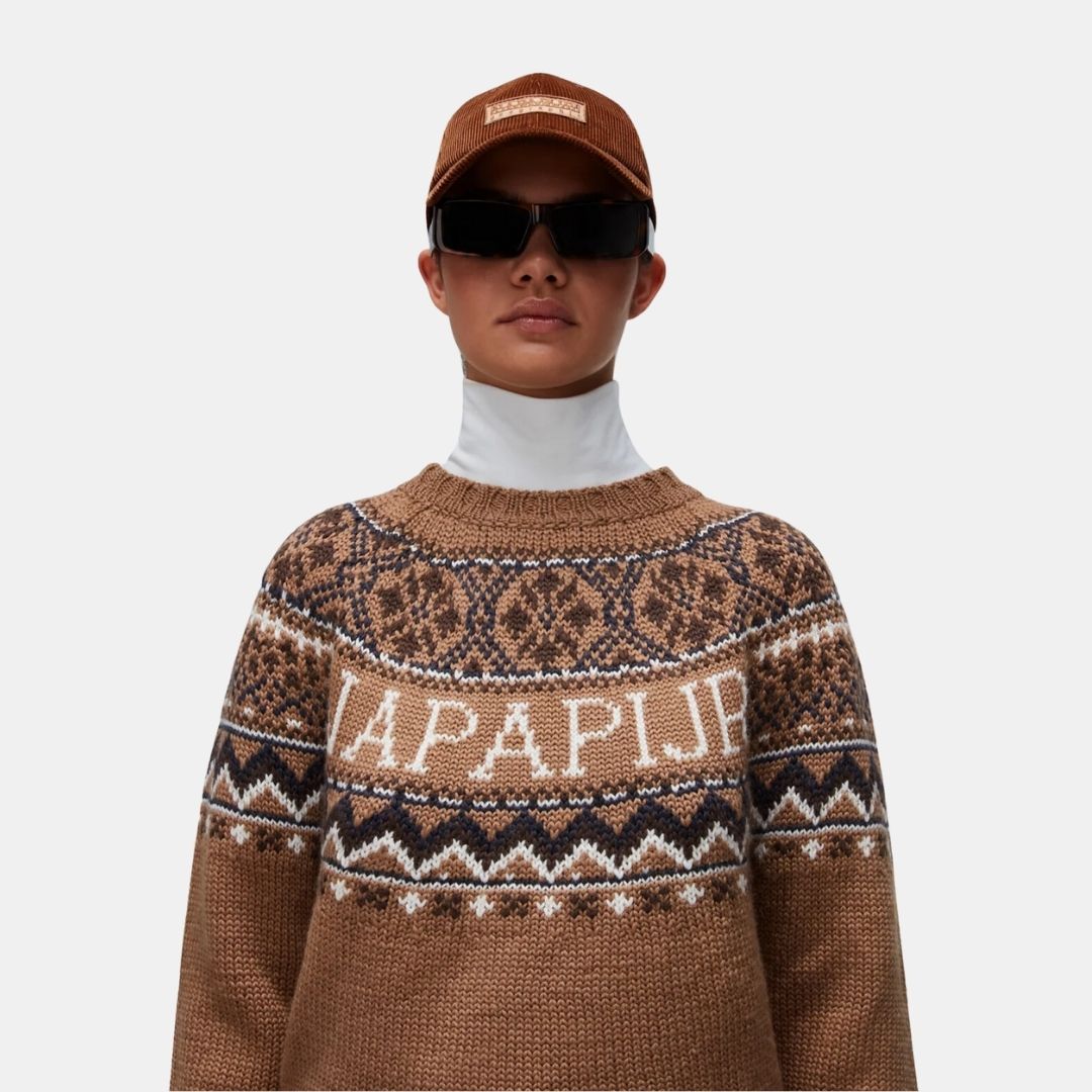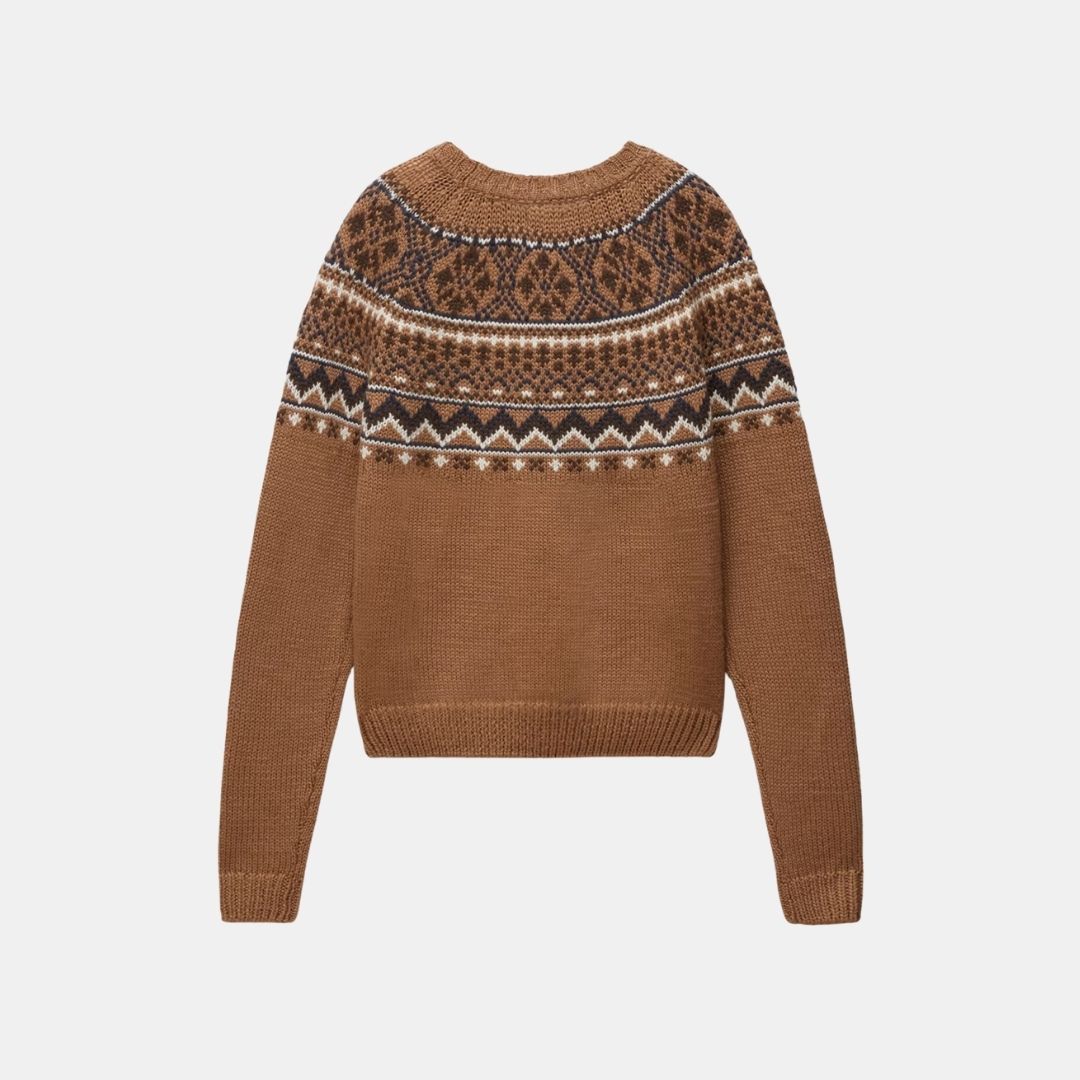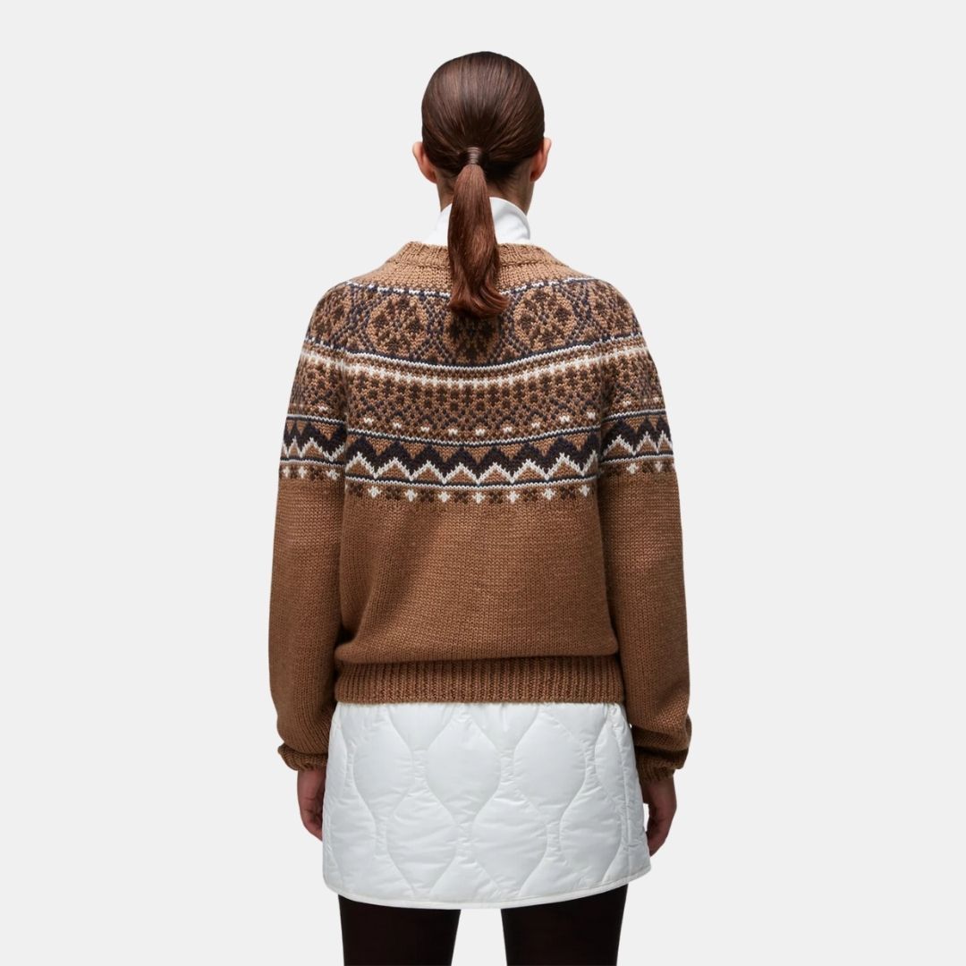 El jersey Ubaye para mujer presenta un diseño de estilo retro, confeccionado en punto Jacquard, elaborado en mezcla de algodón. Se completa con cuello redondo y detalles de canalé.