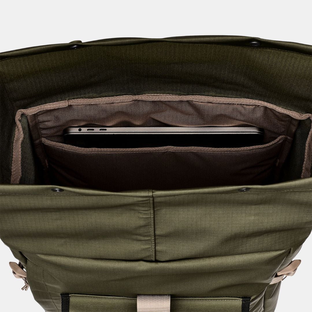 La bolsa principal está confeccionada con tejido antidesgarro 300D de peso medio y la parte inferior es de Oxford mate 600D. El panel trasero y las correas de hombro contorneadas están acolchados con malla espaciadora para mayor transpirabilidad y comodidad. Una correa de esternón ajustable ayuda a mantener las correas en su lugar. Un bolsillo exterior con solapa se superpone a un bolsillo lateral con cremallera para acceder rápidamente a pequeños objetos esenciales. El diseño de cierre enrollable con hebilla es un cierre de eficacia comprobada que evita la entrada de agua y facilita el acceso al compartimento principal. Esta mochila resistente al agua cuenta con un bolsillo interior para portátil y correas de compresión a cada lado para estabilizar cargas de diferentes tamaños.