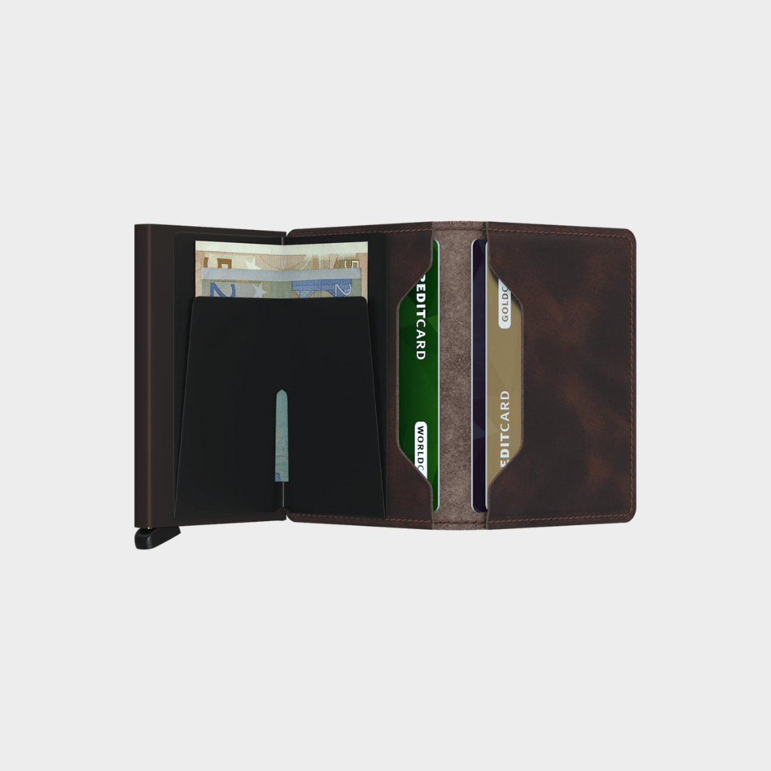 De tamaño pequeño pero con una capacidad sorprendentemente grande: la Miniwallet satisface todas las necesidades. La cubierta exterior puede contener billetes, tickets y tarjetas, mientras que el Cardprotector de aluminio permite extraer las tarjetas con un simple movimiento, evitando que se doblen, rompan o lean sin que nos demos cuenta.