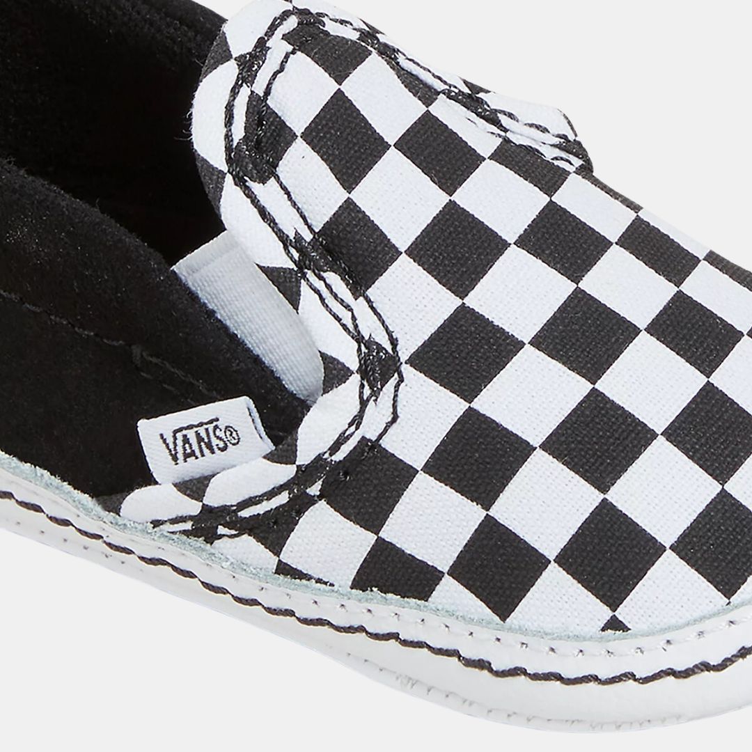 Las Checker Slip-On Crib, renovadas para ofrecer un ajuste perfecto con el mismo estilo que las Classic Slip-On originales, cuentan con unas palas de lona y ante estampadas con el auténtico motivo Checkerboard, una trabilla en el talón para ponerlas y quitarlas con facilidad, y una banda oculta en el interior. Las suelas tienen un diseño nuevo que imita la inconfundible suela reticular waffle de Vans y el panel en el talón completa este diseño clásico.
