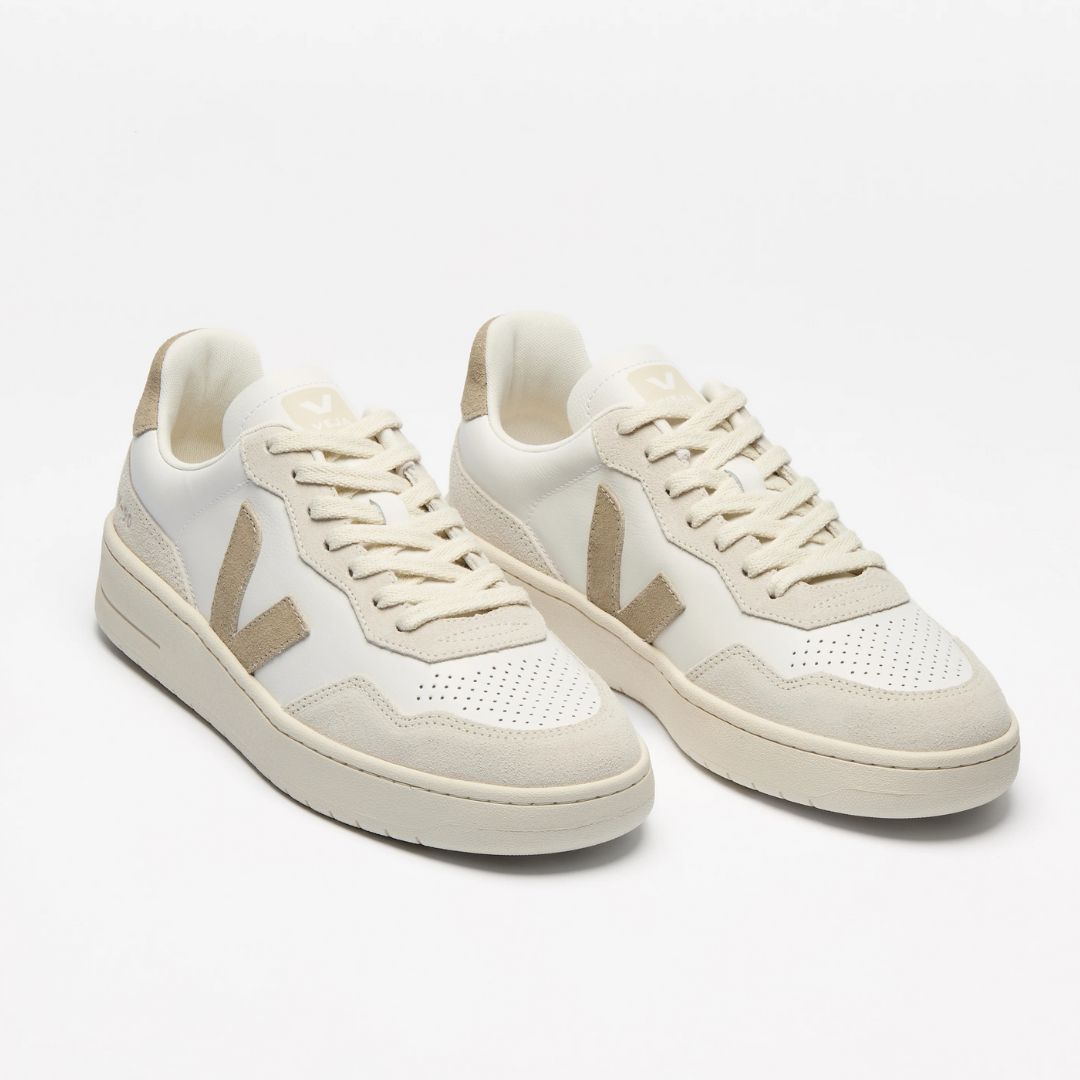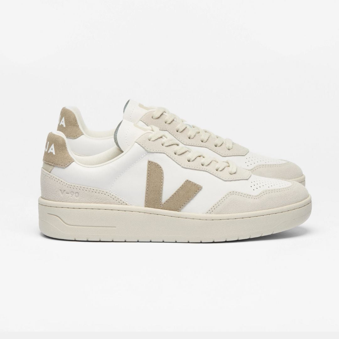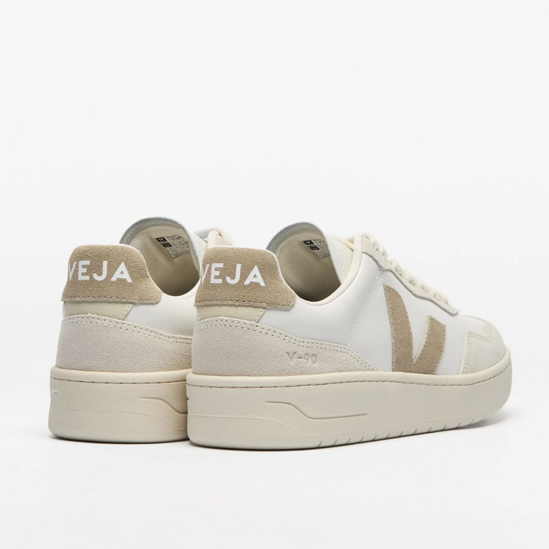 Creando un estilo unisex que parece a la vez retro y moderno, la V-90 mezcla un estilo retro de los 90 con un toque moderno. La zapatilla ofrece un buen equilibrio entre estilo y comodidad. Fabricada con el cuero más suave hasta ahora adquirido por VEJA - cuero O.T. (Organic Traced leather), procedente de granjas de Uruguay con certificación 100% ecológica. Este tipo de cuero se somete a un proceso de golpe mecánico que lo vuelve fino y flexible.