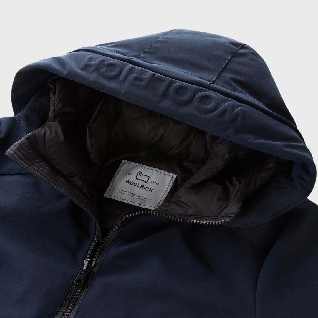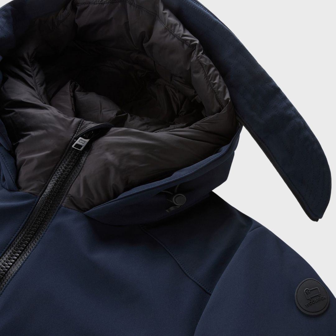 La silueta de la icónica parka reinventada en una versión de Tech Softshell, un tejido impermeable y cortavientos. Con relleno de plumón de pato y con acolchado horizontal en el interior, tiene una capucha con una inserción desmontable con la inscripción Woolrich en relieve y el cierre de cremallera bidireccional. No faltan los detalles que recuerdan al modelo clásico: los bolsillos calientamanos en la parte superior, los de solapa en la parte inferior y los puños interiores elásticos. En el interior cuenta con un cómodo cordón para regular el ajuste y un bolsillo de malla con botón a presión para mantener los objetos a buen recaudo. Las aberturas laterales con botones a presión permiten llevarla incluso sobre prendas voluminosas. todo momento.