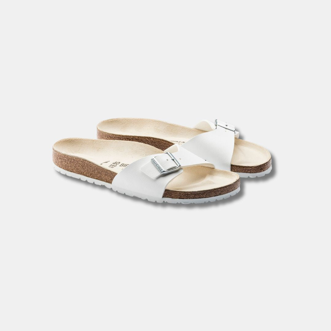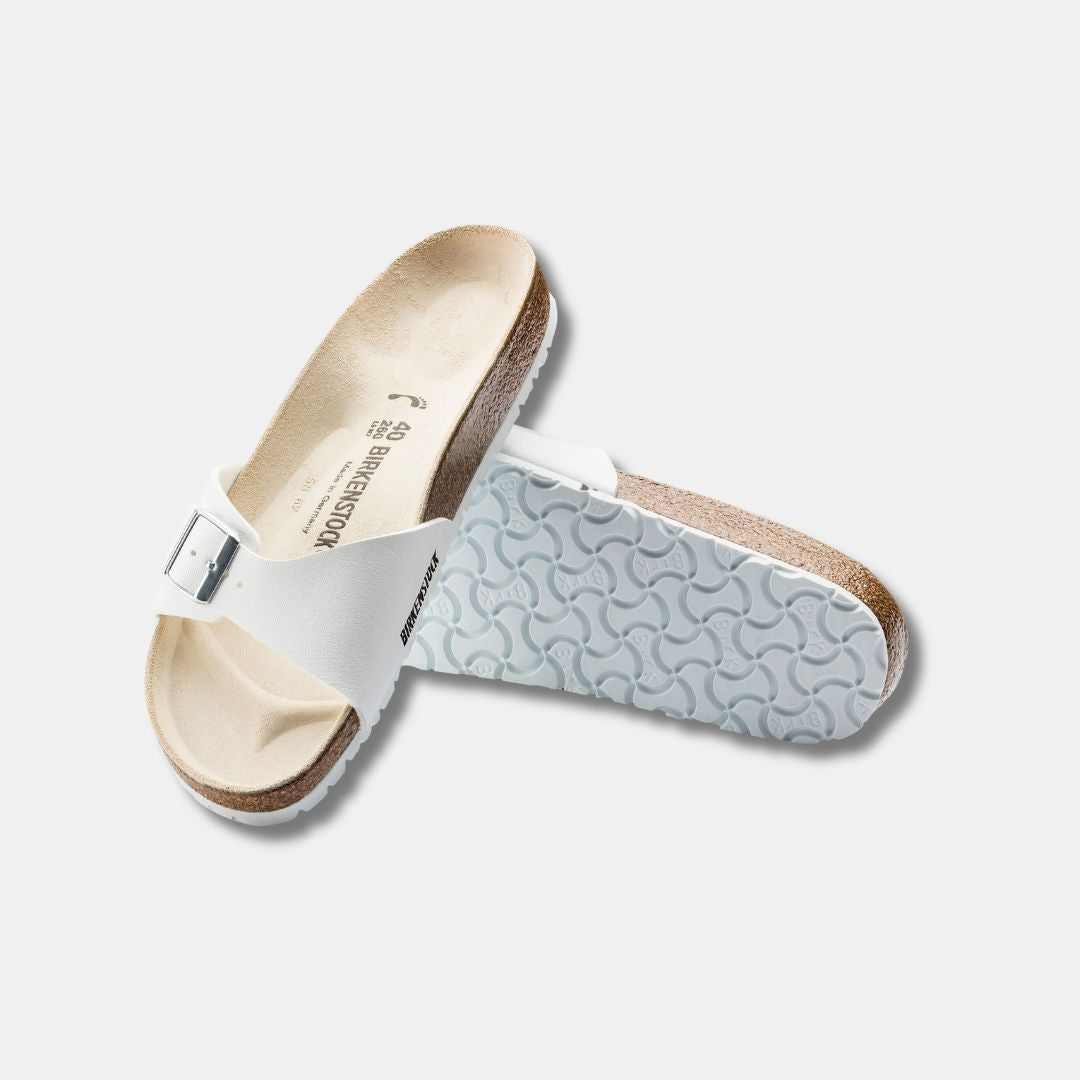 Die originale BIRKENSTOCK-Sandale. Ein Riemen, eine Schnalle und ein konturiertes Korkfußbett ergeben zusammen meisterhaft den Madrid. Das Obermaterial besteht aus dem strapazierfähigen, hautfreundlichen Synthetikmaterial Birko-Flor®.