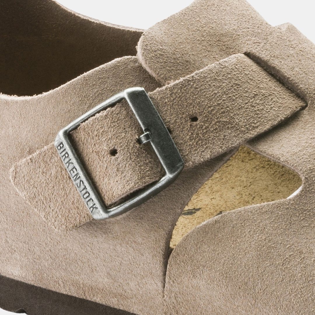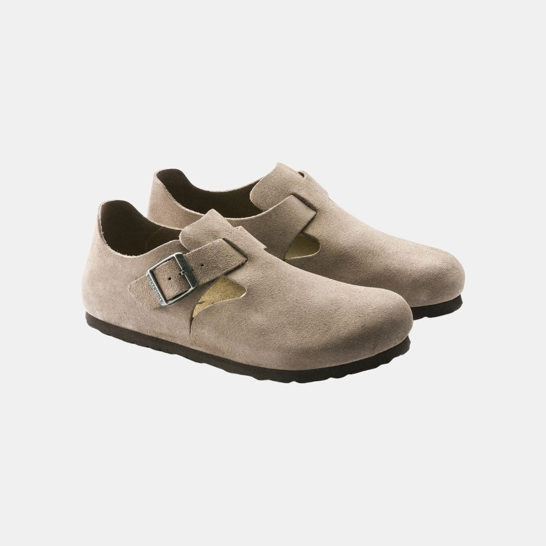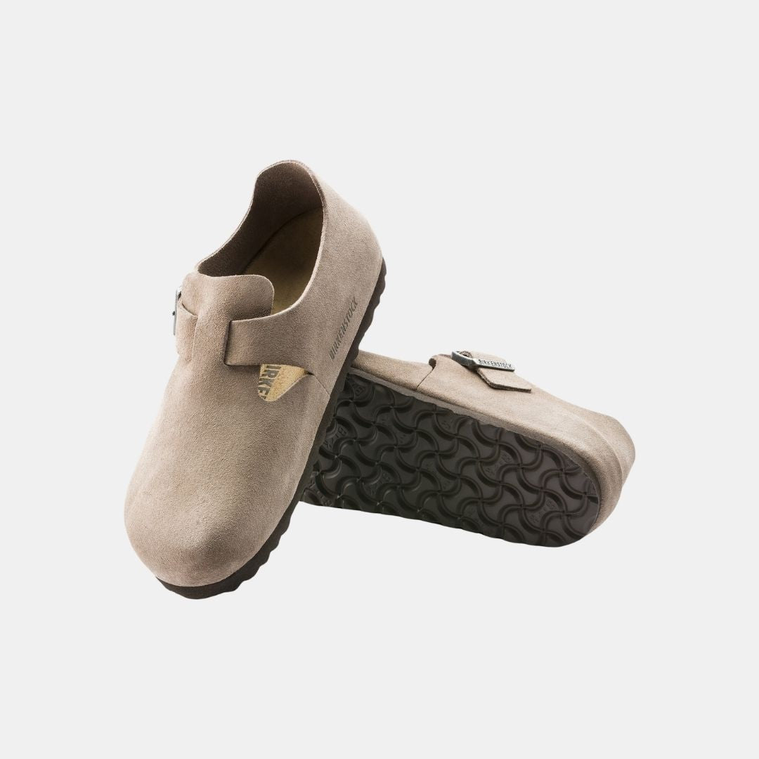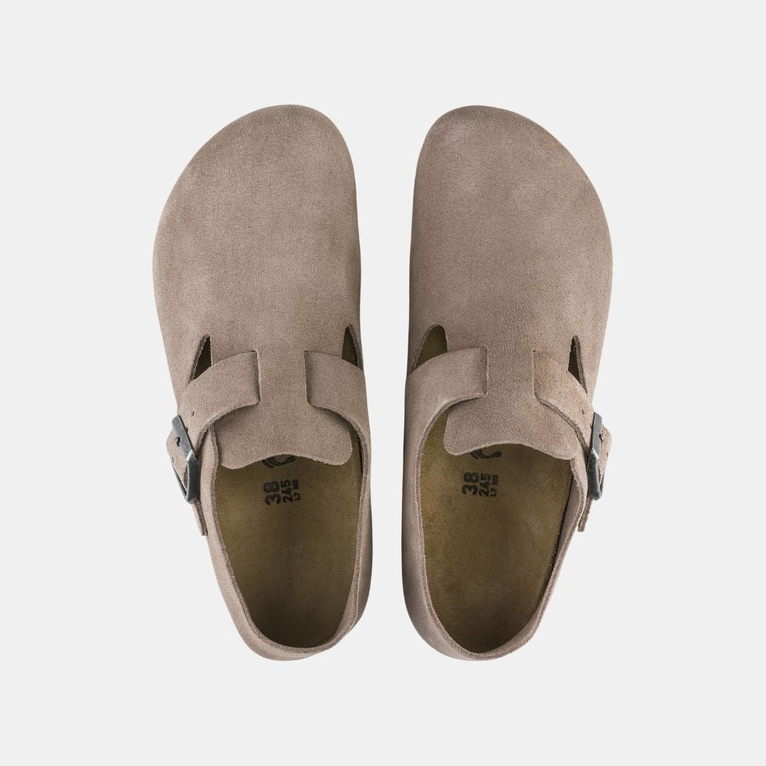 Das Modell BIRKENSTOCK London ist eine Variante, die auf dem klassischen Boston basiert. Der erhöhte Fersenbereich zeichnet diesen schlichten, nahtlosen Schuh aus. Das Modell besticht durch sein rustikales und natürliches Aussehen, sowie dadurch, dass es mit eingerissenem Rand und ohne Futter gefertigt ist. Das sehr weiche Obermaterial aus Wildleder sorgt zudem für ein natürliches Design, das sich wie eine zweite Haut an den Fuß anpasst.