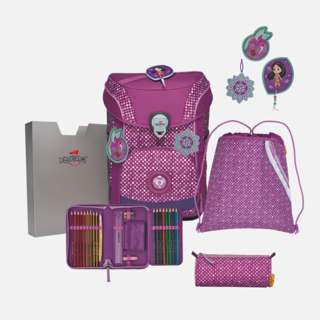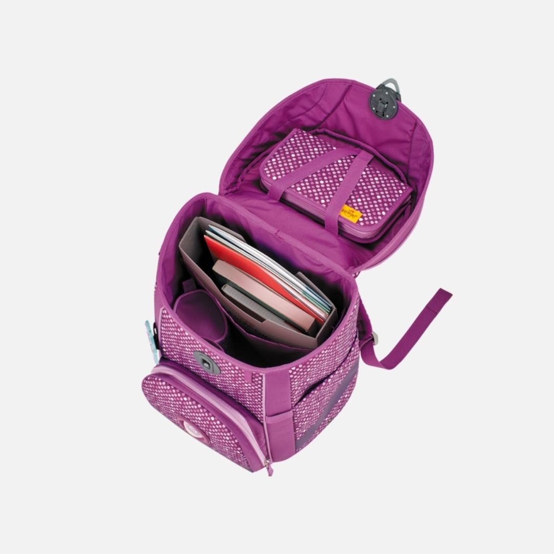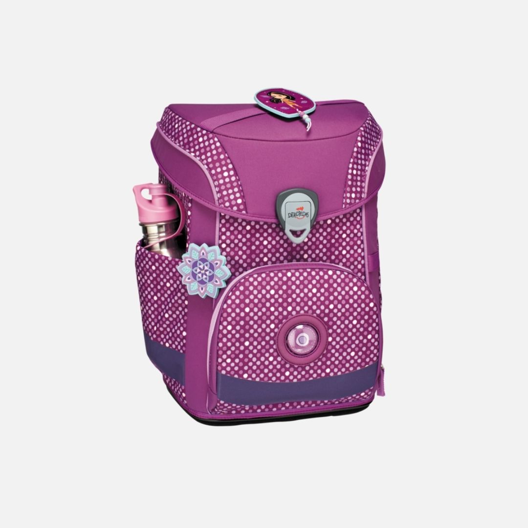 Bequemer denn je: Der ErgoFlex Easy bietet mit seiner schlanken, aber stabilen Silhouette viel Platz für Bücher, Notizbücher und mehr. Und es wiegt nur etwa 950 Gramm! Die stylischen Farben und die trendigen Purple Dots Wechselknöpfe und Anhänger machen die Tasche zu einem absoluten Hingucker. Dank seines cleveren Tragegurtsystems wächst er mit und entlastet den Rücken Ihres Kindes. Große retroreflektierende Flächen sorgen für einen sicheren Schulweg. Das Beste aber ist, dass die ErgoFlex Easy Purple Dots im praktischen Komplettset geliefert werden, das 2 Wechselknöpfe und 1 Etikett, eine Notebooktasche, eine Sporttasche, ein Federmäppchen und eine Schülermappe enthält. So macht Schule Spaß!