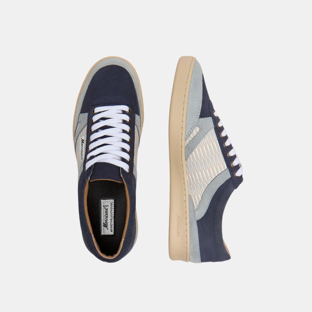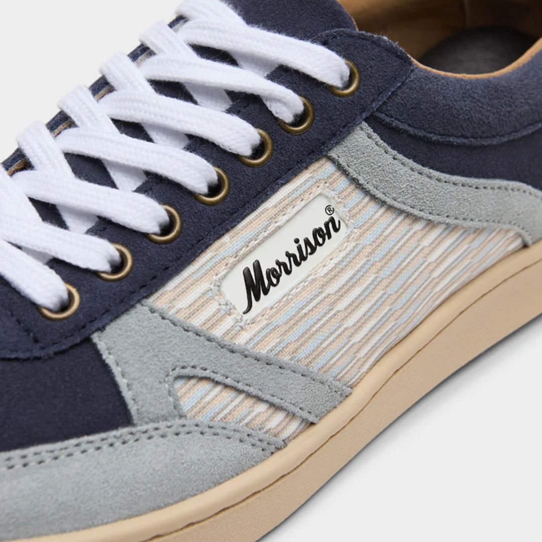 Für Liebhaber von Komfort, die nicht auf Stil verzichten möchten. Hergestellt aus dunkelblauem und himmelblauem Veloursleder mit seitlichem Druck, werden sie dein Basic der neuen geometrischen Saison sein, mehr Morrison als je zuvor.