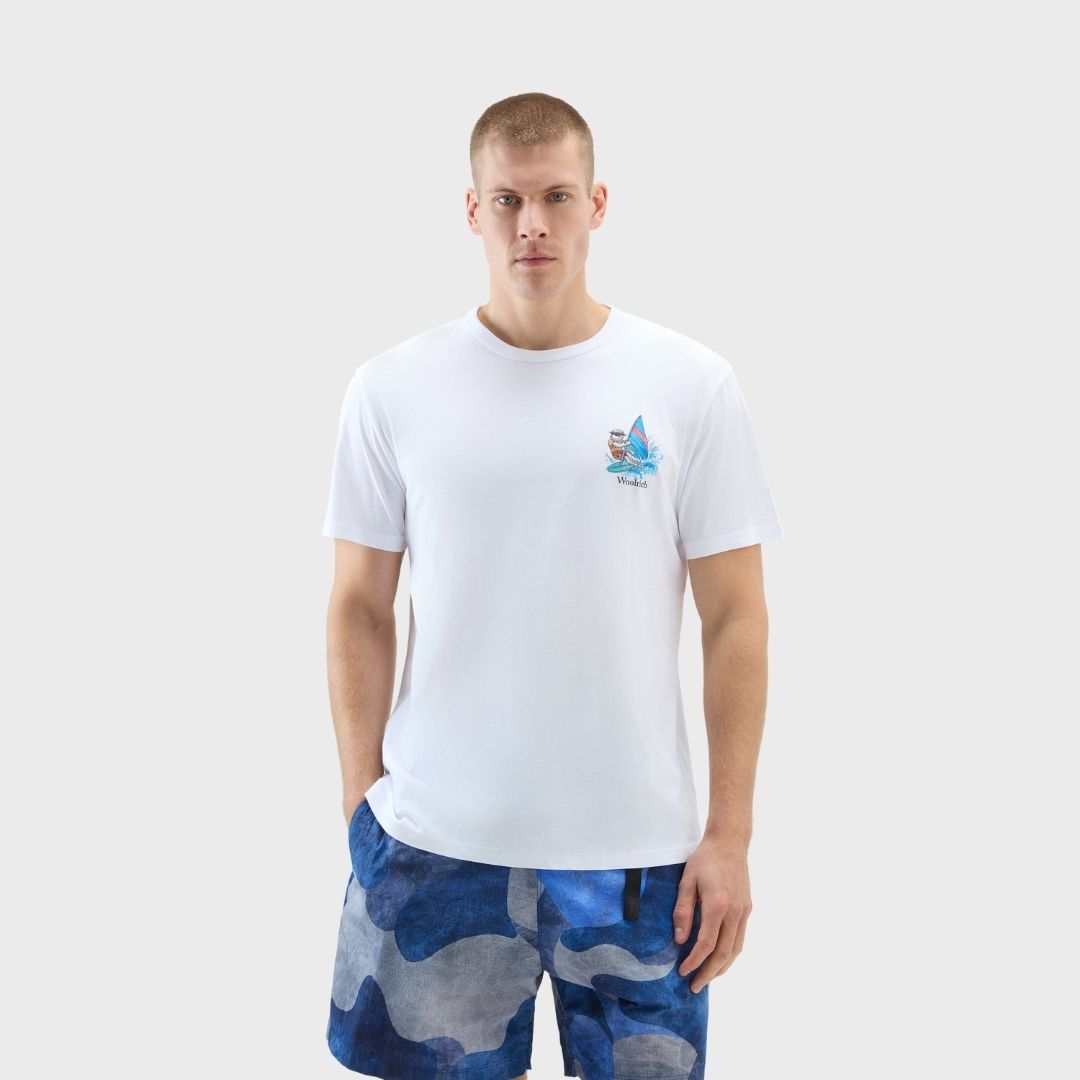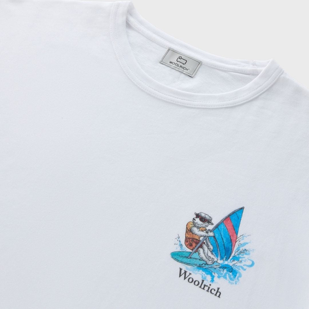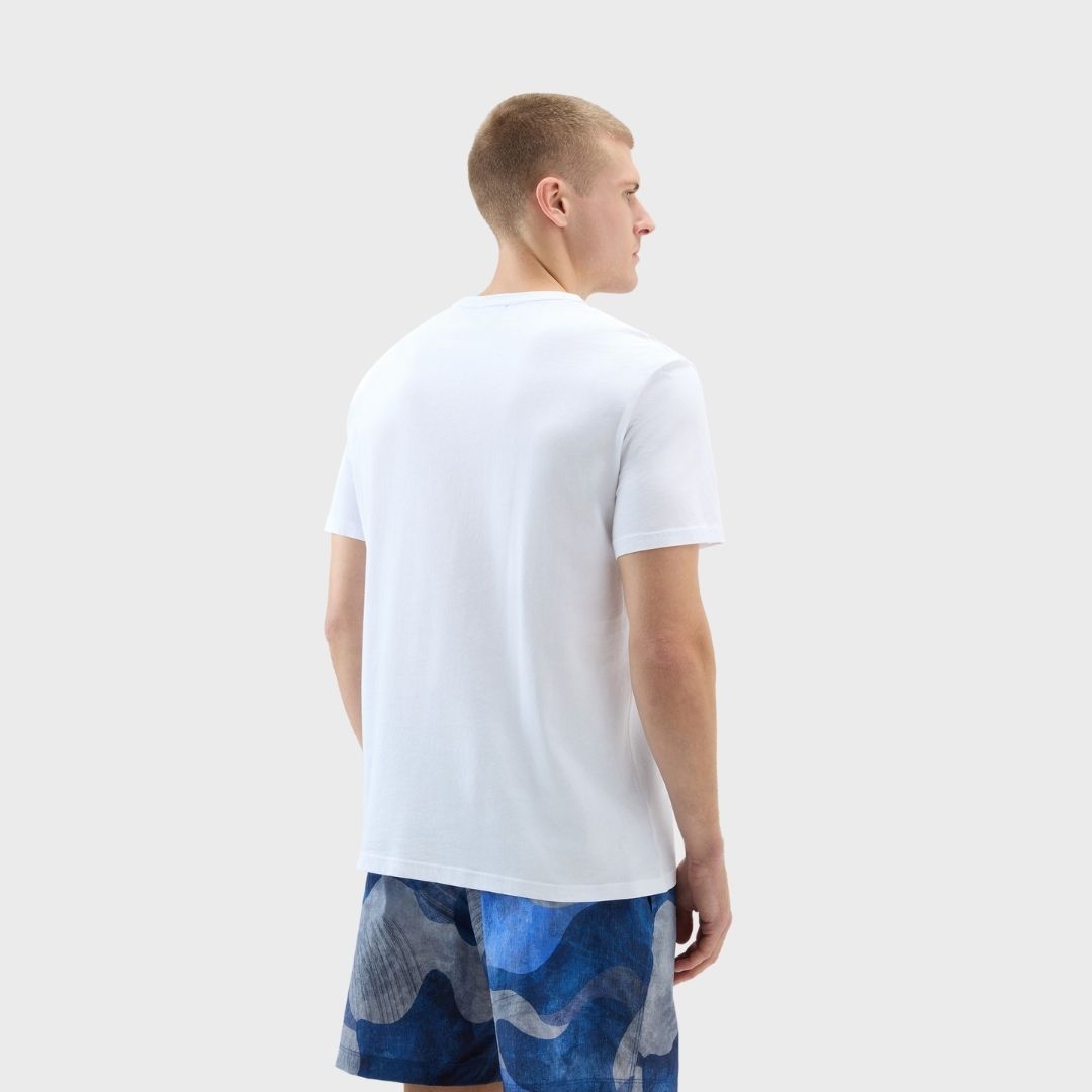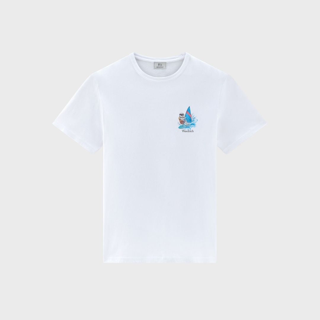 Ein T-Shirt, das funktionelles Design, hochwertige Materialien und grafische Anspielungen auf das Erbe von Woolrich vereint. Das Modell besteht aus reinem Bio-Baumwoll-Jersey-Stoff und verfügt über einen Aufdruck auf der Brust, der das klassische Schaf-Logo im Cartoon-Stil neu interpretiert.