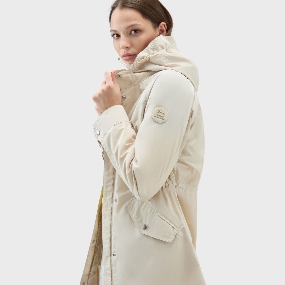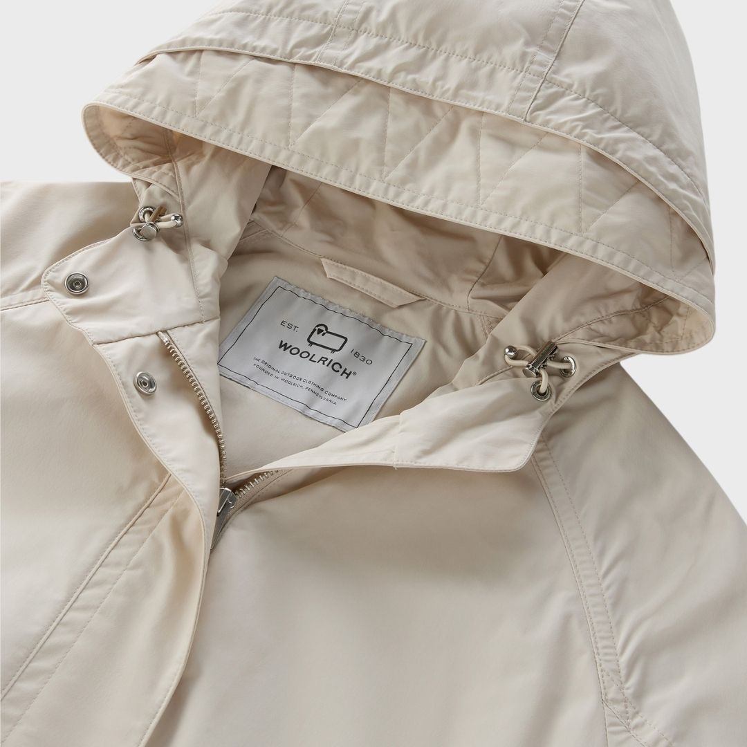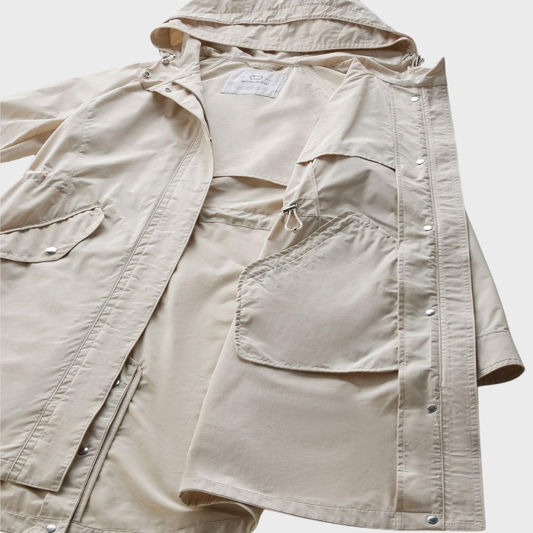 Dieser Parka ist vom Arctic Parka von Woolrich inspiriert, verleiht dem ikonischen Modell jedoch eine leichte Konsistenz für die warmen Jahreszeiten. Es besteht aus wasserabweisendem und windabweisendem Urban Touch-Material, um Komfort und Schutz vor leichtem Regen zu gewährleisten. Seine Linien sind klar und es verfügt über funktionale Details wie die verstellbare Kapuze mit Schirm. Es verfügt über einen verdeckten Reißverschluss und Druckknopfverschluss, verstellbare Druckknopfmanschetten, Eingrifftaschen mit Klappen und eine Rückenöffnung mit Druckknöpfen. Mit dem innenliegenden Kordelzug können Sie die Passform anpassen.
