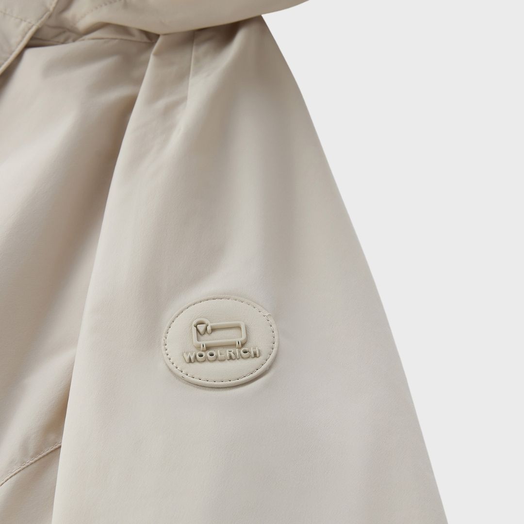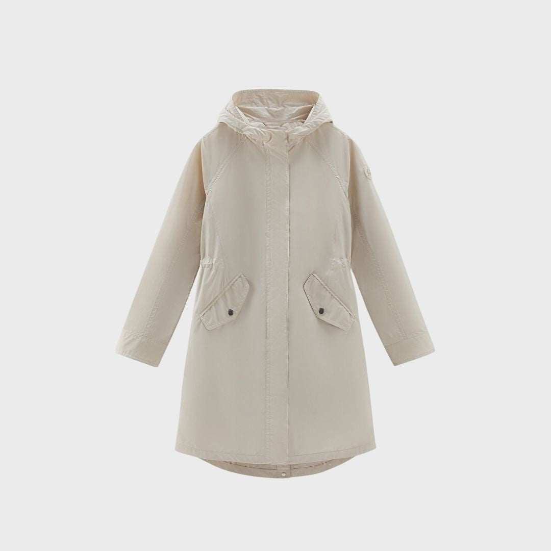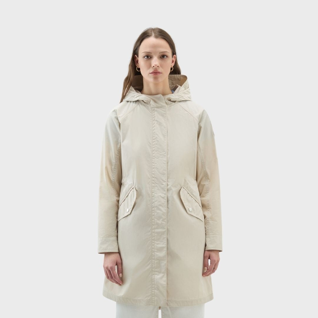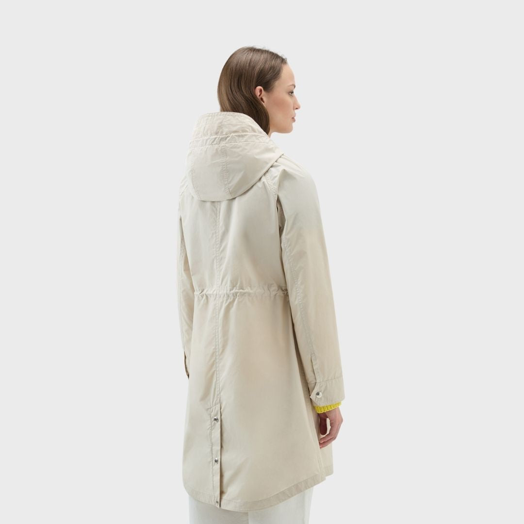 Dieser Parka ist vom Arctic Parka von Woolrich inspiriert, verleiht dem ikonischen Modell jedoch eine leichte Konsistenz für die warmen Jahreszeiten. Es besteht aus wasserabweisendem und windabweisendem Urban Touch-Material, um Komfort und Schutz vor leichtem Regen zu gewährleisten. Seine Linien sind klar und es verfügt über funktionale Details wie die verstellbare Kapuze mit Schirm. Es verfügt über einen verdeckten Reißverschluss und Druckknopfverschluss, verstellbare Druckknopfmanschetten, Eingrifftaschen mit Klappen und eine Rückenöffnung mit Druckknöpfen. Mit dem innenliegenden Kordelzug können Sie die Passform anpassen.