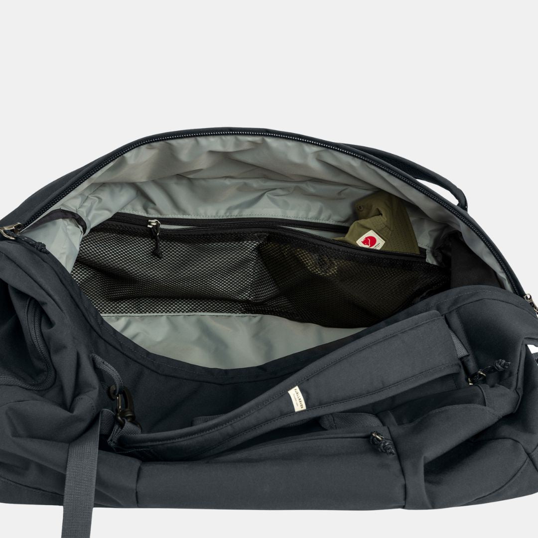 Bolso de viaje resistente al agua y duradera, fabricada con poliamida reciclada y laminada. Las correas de la mochila tienen una forma ergonómica para mayor comodidad, por lo que también pueden usarse como asas de transporte y guardarse para facturar en vuelos. La cremallera principal de la Färden Duffel 50 se puede cerrar con llave y cuenta con un bolsillo exterior con cremallera. La bolsa también cuenta con un compartimento para botas con cerradura y un amplio bolsillo de malla con dos compartimentos interiores y correas de compresión en cada extremo. El acolchado en la parte superior y la base protege el contenido de golpes y sacudidas.