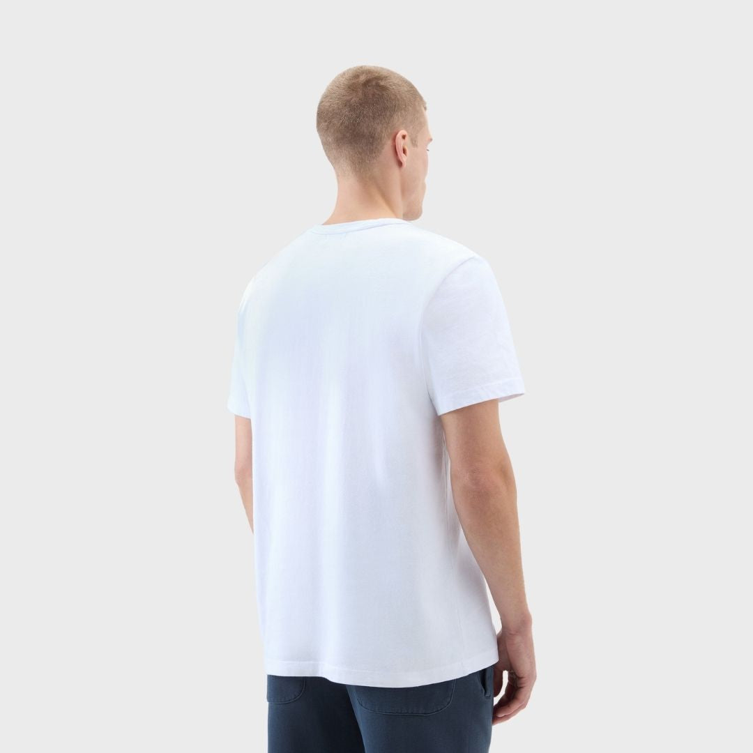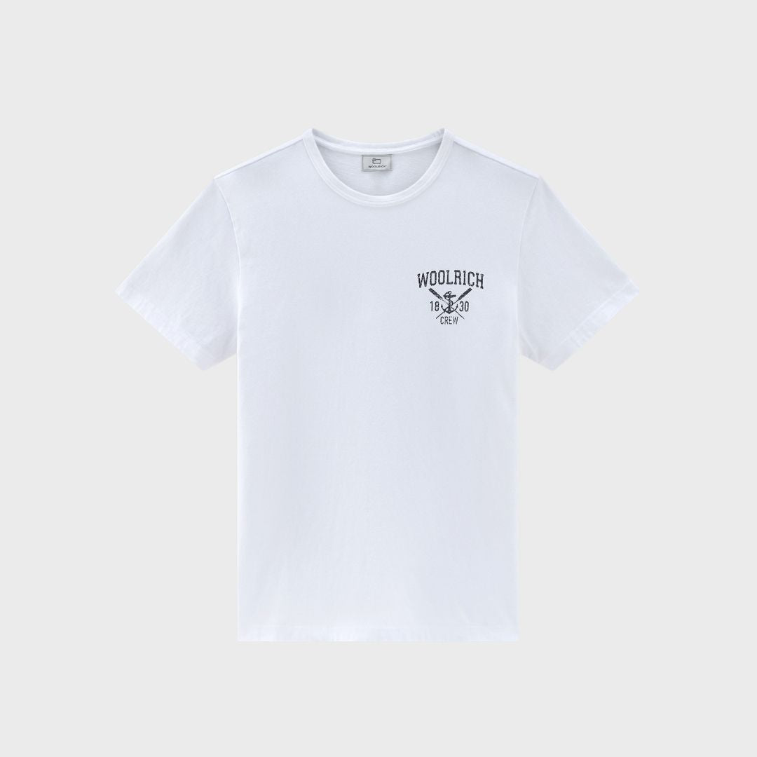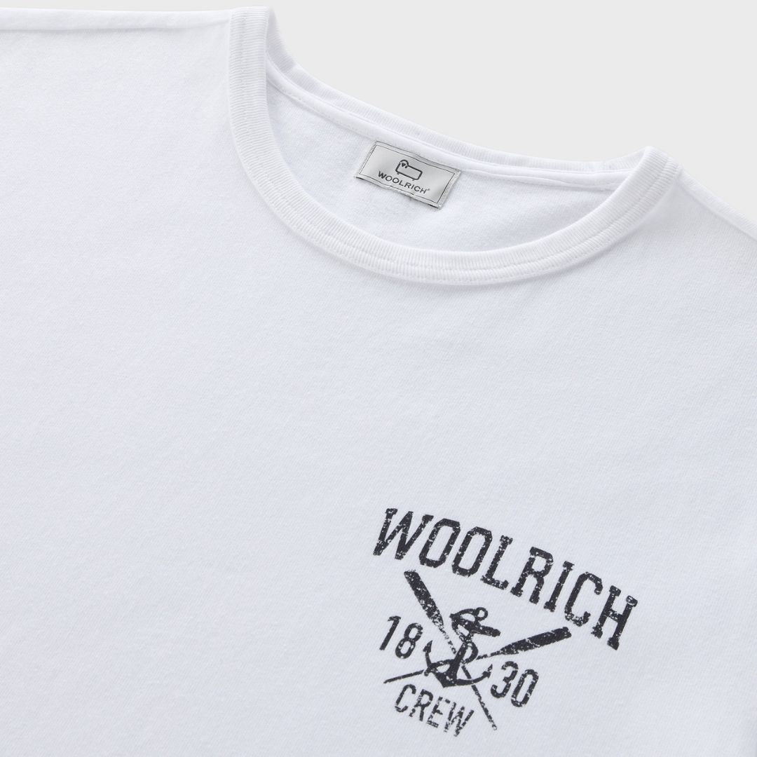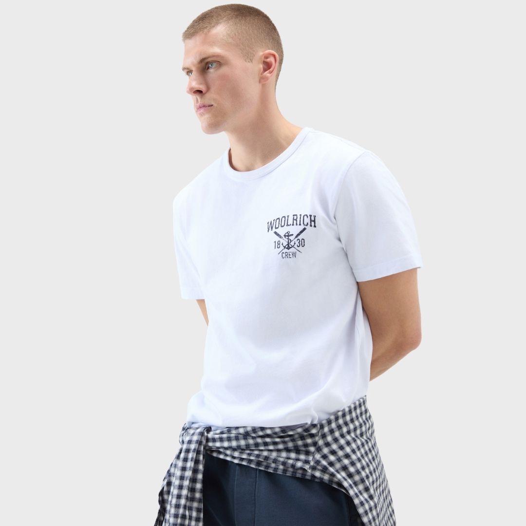 Das T-Shirt hat eine bequeme Passform, ist praktisch zu tragen und raffiniert im Detail. Das Modell besteht aus reinem und dickem Baumwoll-Jersey-Stoff, der sich kompakt und weich auf der Haut anfühlt. Es zeichnet sich durch sein vielseitiges Design und den nautisch inspirierten Woolrich 1830 Crew-Brustdruck aus.