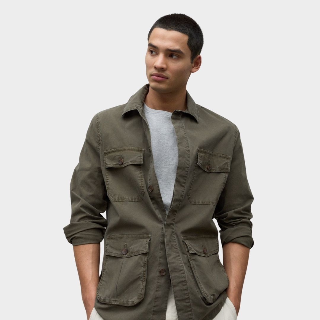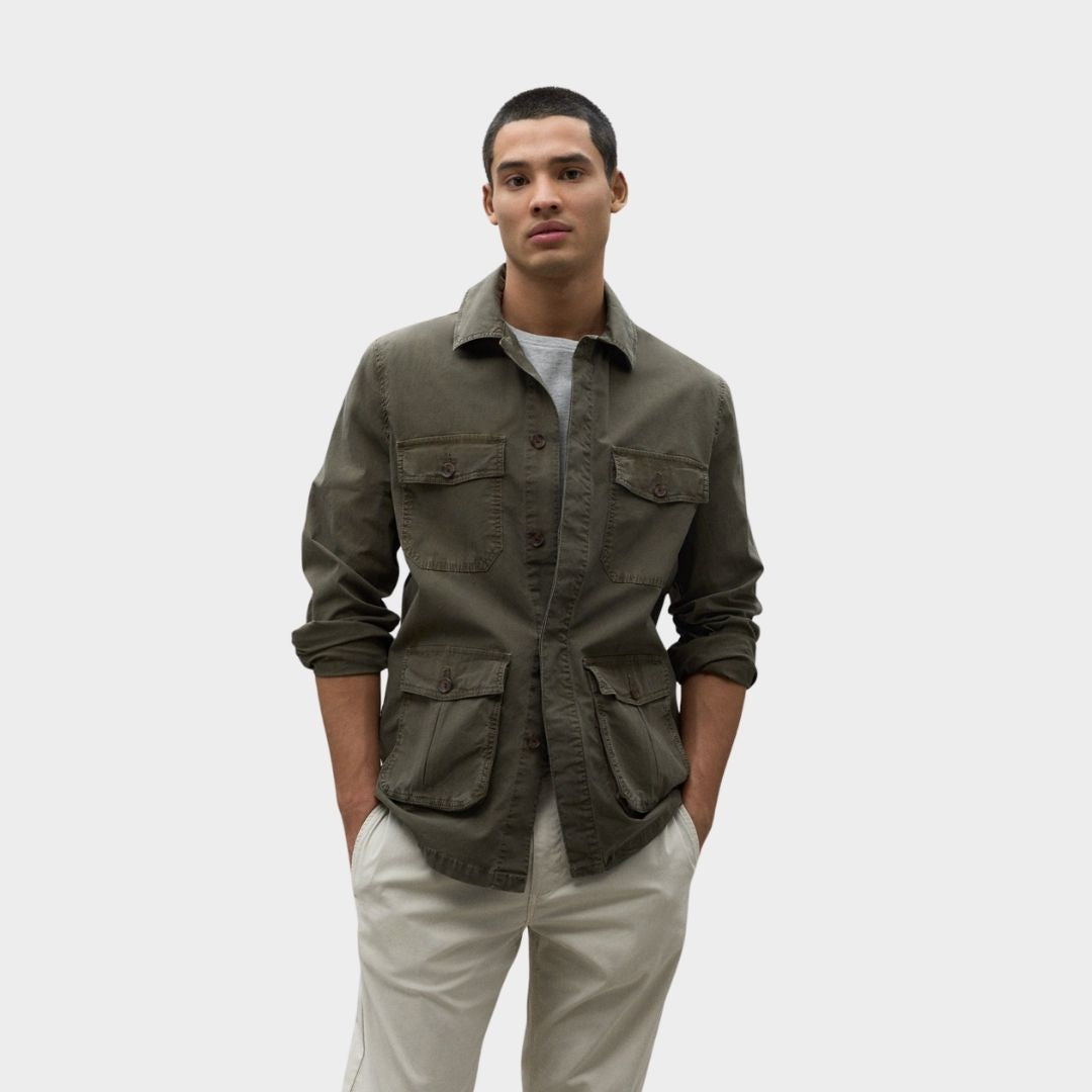 La chaqueta Safari está hecha de una mezcla de algodón y algodón reciclado, obtenido mediante la recolección, clasificación y proceso de prendas usadas o residuos textiles que contienen algodón. Una alternativa sostenible que aprovecha materiales existentes y reduce el impacto ambiental asociado con la producción textil.